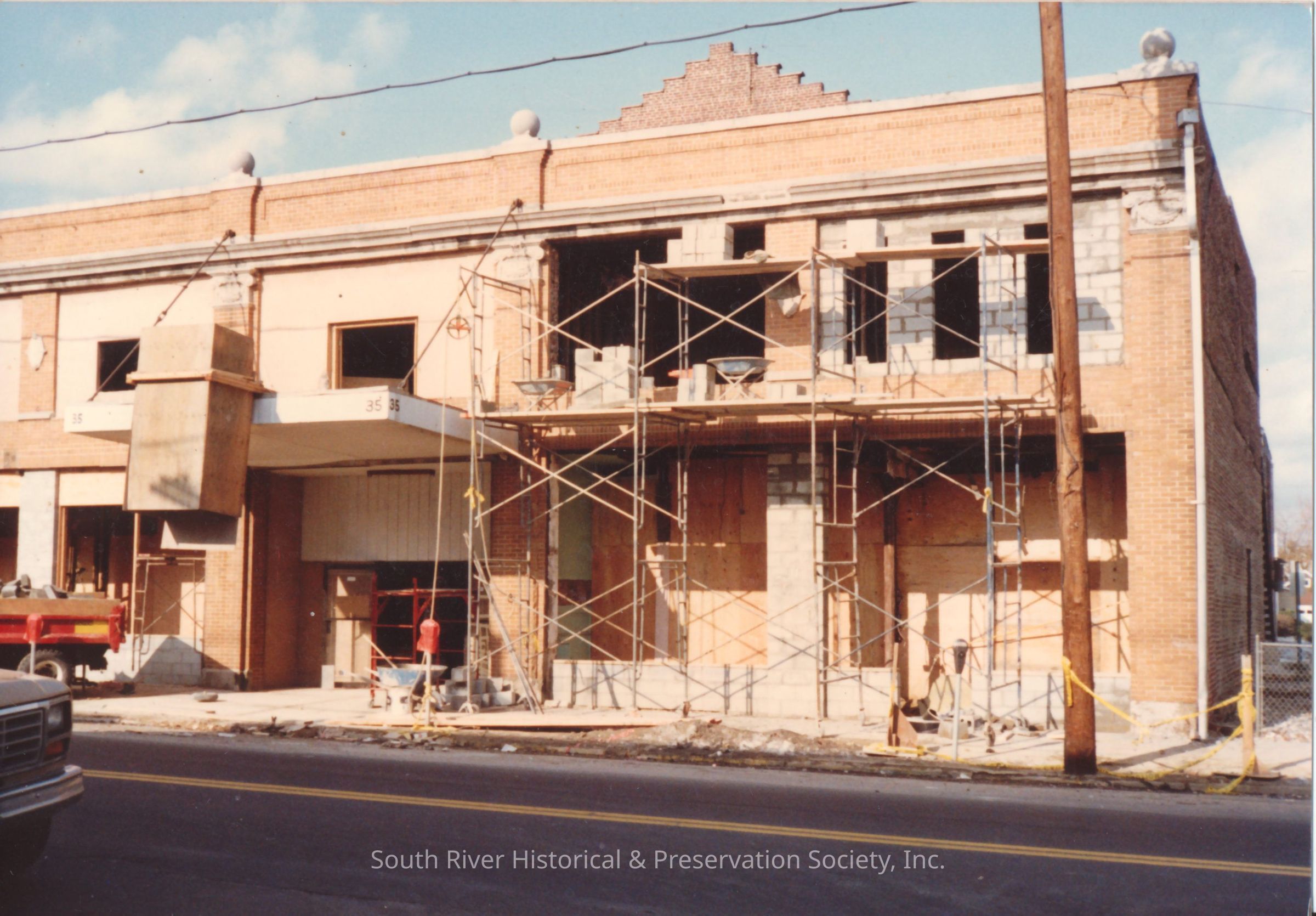 Color photograph of the former Capitol Theatre building at 35 - 39 Main Street undergoing renovations for use as a factory and warehouse for the assembly and distribution of electronics and retail stores. View is of the front right end of the building with scaffolding and the rear end of a truck visible on the sidewalk at the far left. The side of the building is also visible.