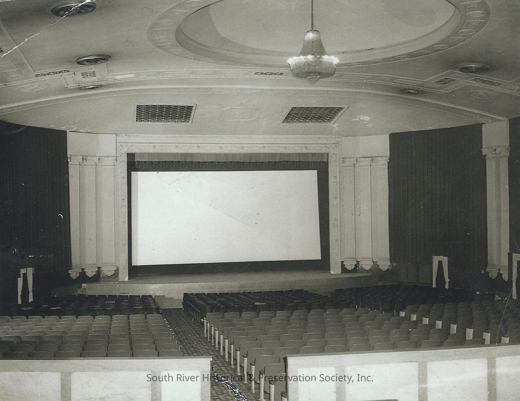 Digital copy of a black and white photograph of the auditorium of the Capitol Theatre on Main Street. The movie screen is visible above the stage at the front of the room. The seating slopes downward in front of a low dividing wall. The center of the ceiling is domed with a crystal chandelier suspended from the center.