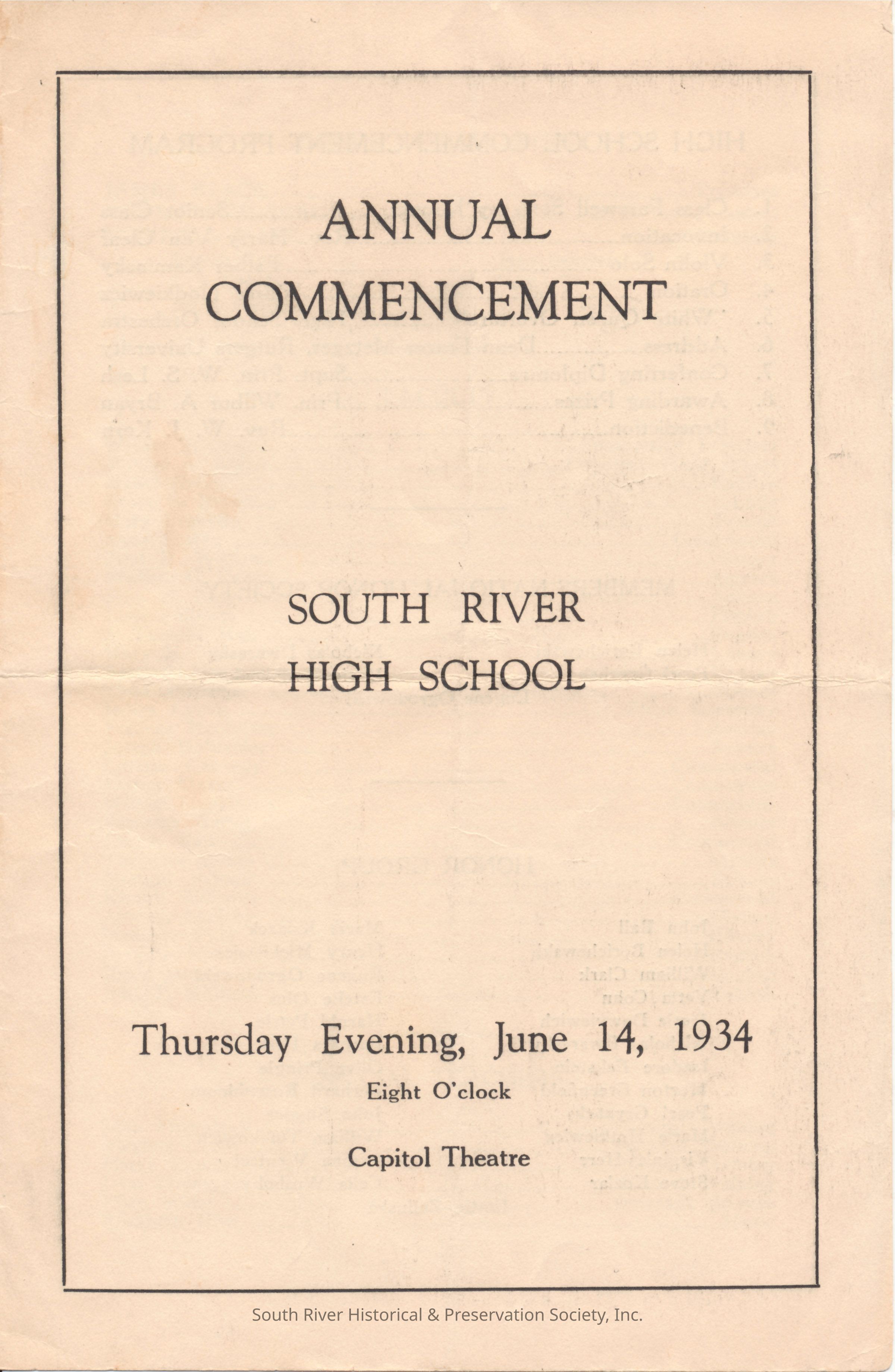Commencement program with text on the front cover that reads, "Annual Commencement, South River High School, Thursday Evening, June 14, 1934, Eight O'Clock, Capitol Theatre."