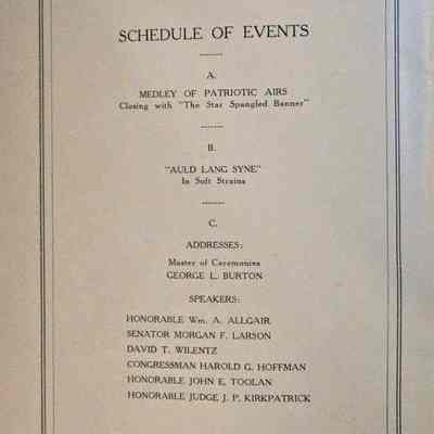 Contents of the booklet include: a "Dedicatory Announcement" that provides a brief description of the features of the new theater, a "Schedule of Events" for the opening, general information about theater admission and performances, the "Programme" schedule for the following week, identification of the businesses involved in the construction of the theater, booster ads, and other information.