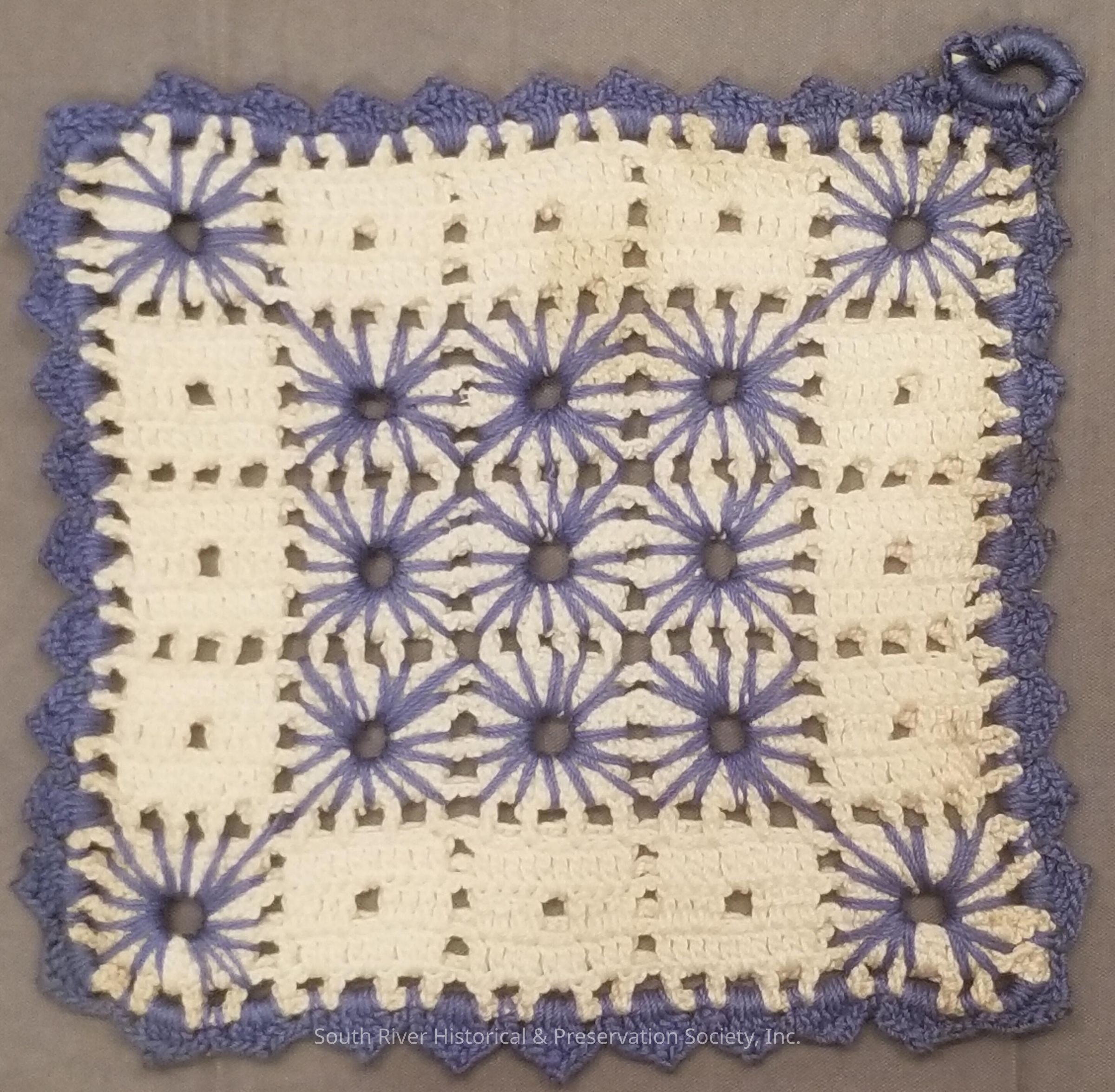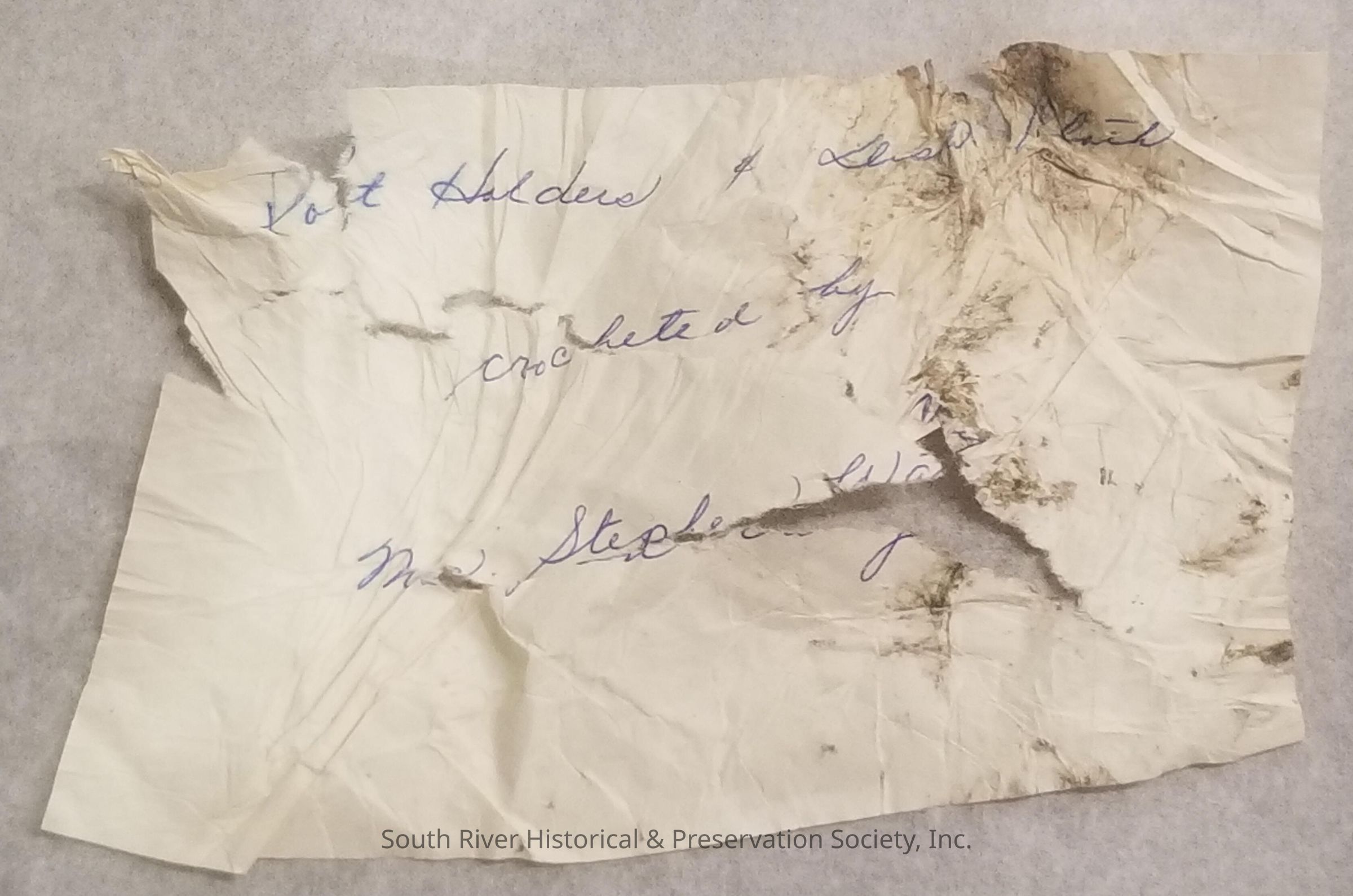 Accompanied by a note in poor condition that reads, "Pot Holders & Dish Cloth crocheted by Mrs. Stephen Watsey."Acquisition