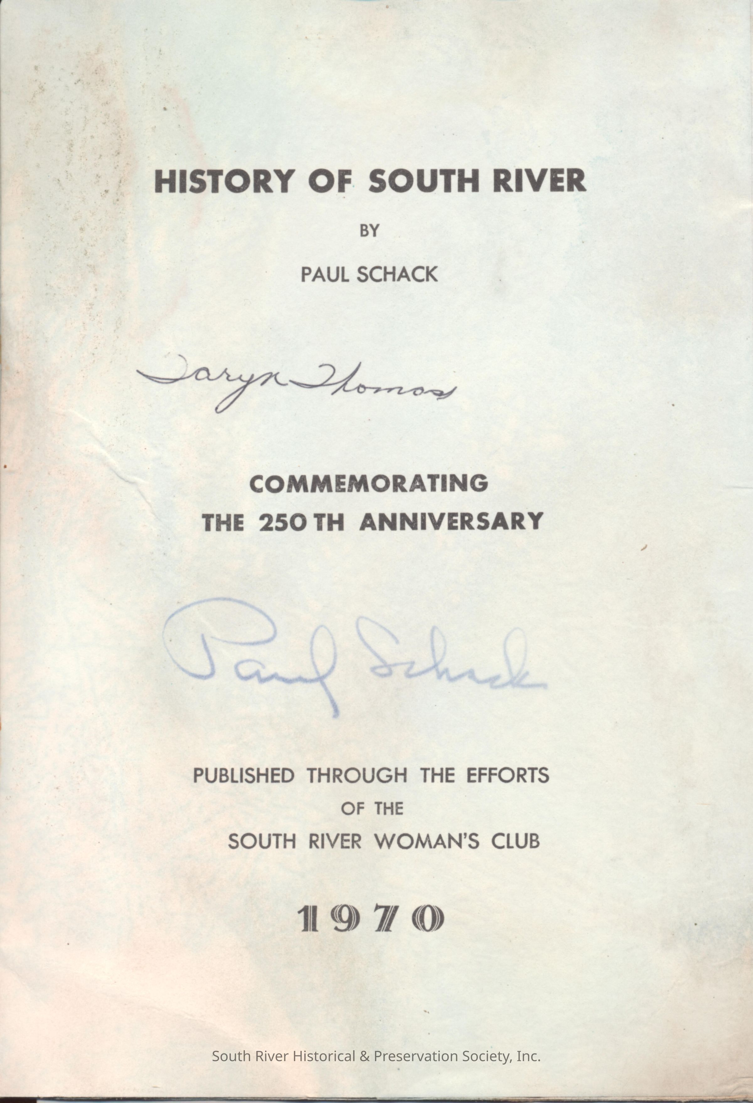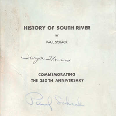 Booklet written by Paul Schack and published through the efforts of the South River Woman's Club to commemorate South RIver's 250th anniversary in 1970. Content is a brief history of South River from 1664 until 1898 when the bill to incorporate South River as a borough was passed.