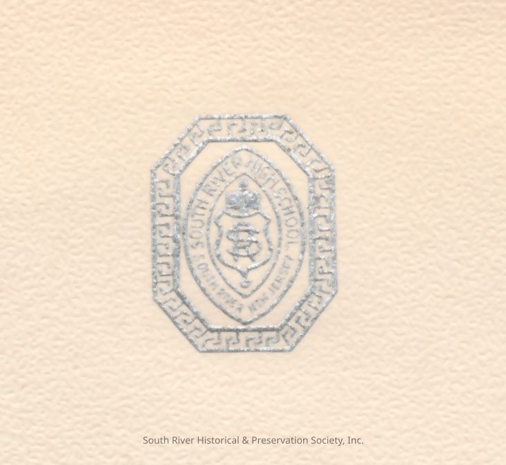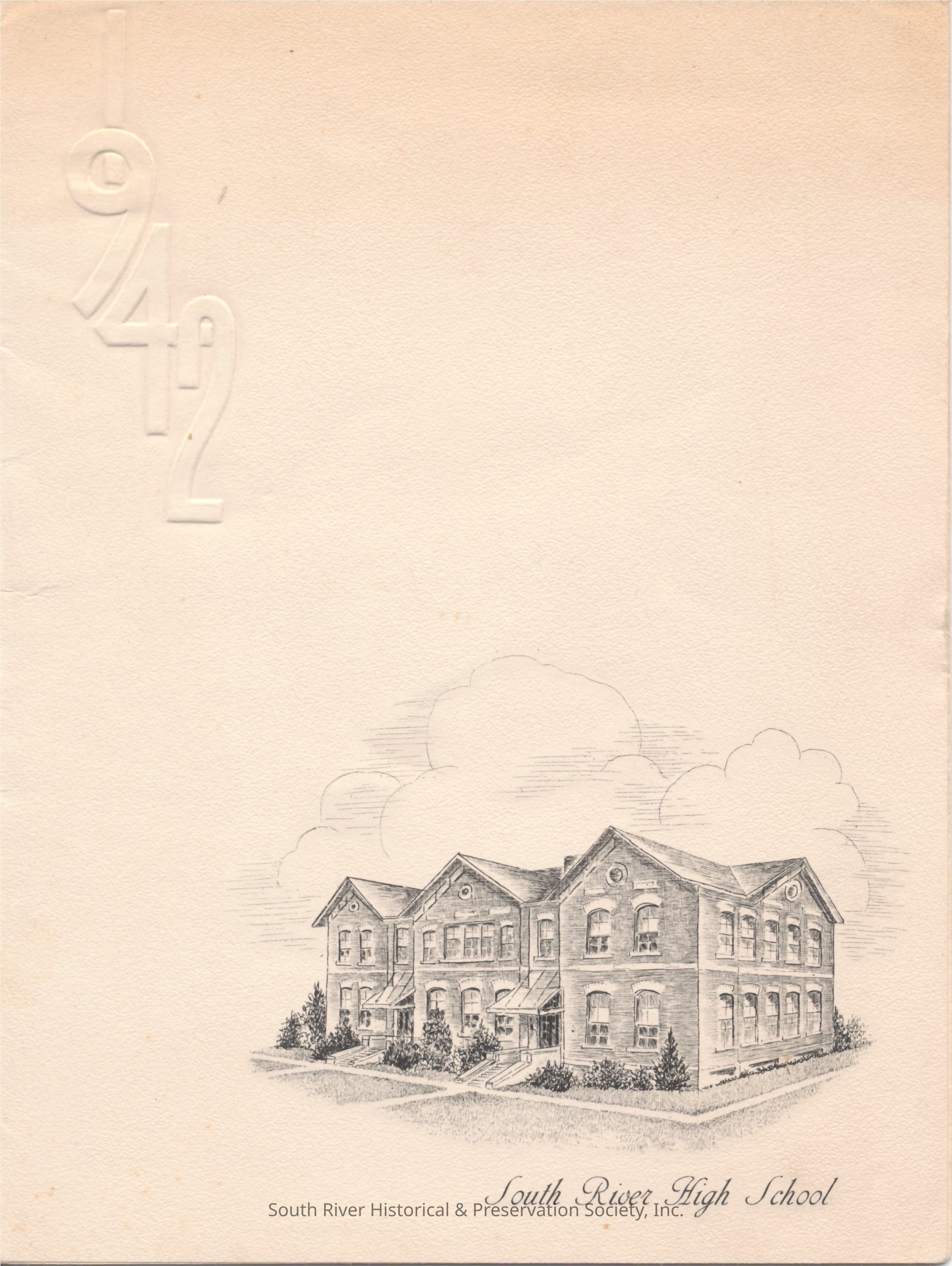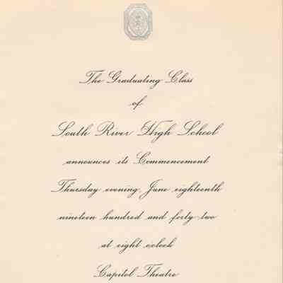 Formal announcement of the South River High School 1942 commencement ceremony. The front has the year 1942 embossed in the upper left corner and in the lower right corner, a sketch of the building with "South River High School" printed below it.