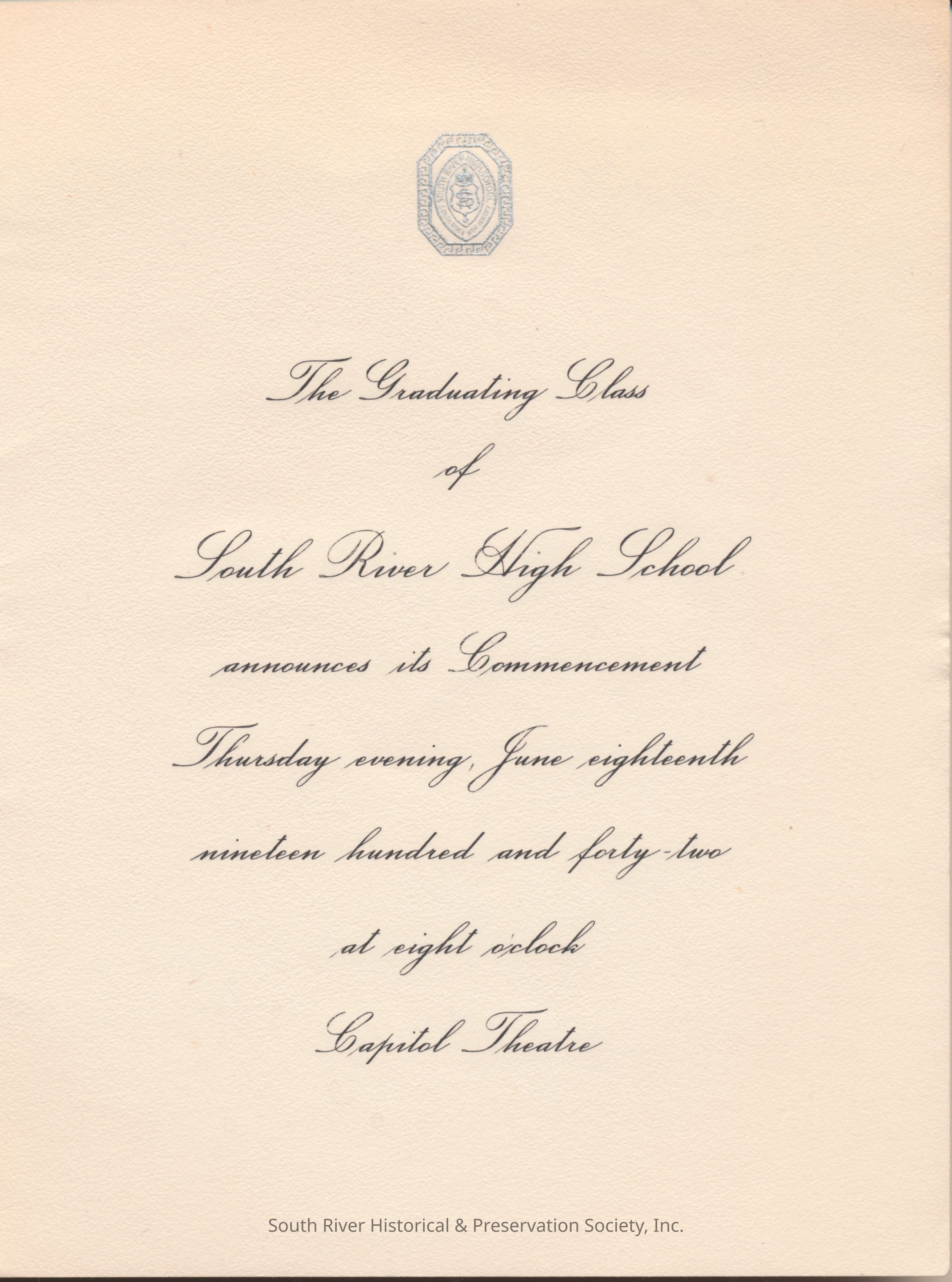The text on the inside of the announcement reads, "The Graduating Class of South River High School announces its Commencement, Thursday evening, June eighteenth, nineteen hundred and forty-two, at eight o'clock, Capitol Theatre". A silver South River High School seal appears above the text.