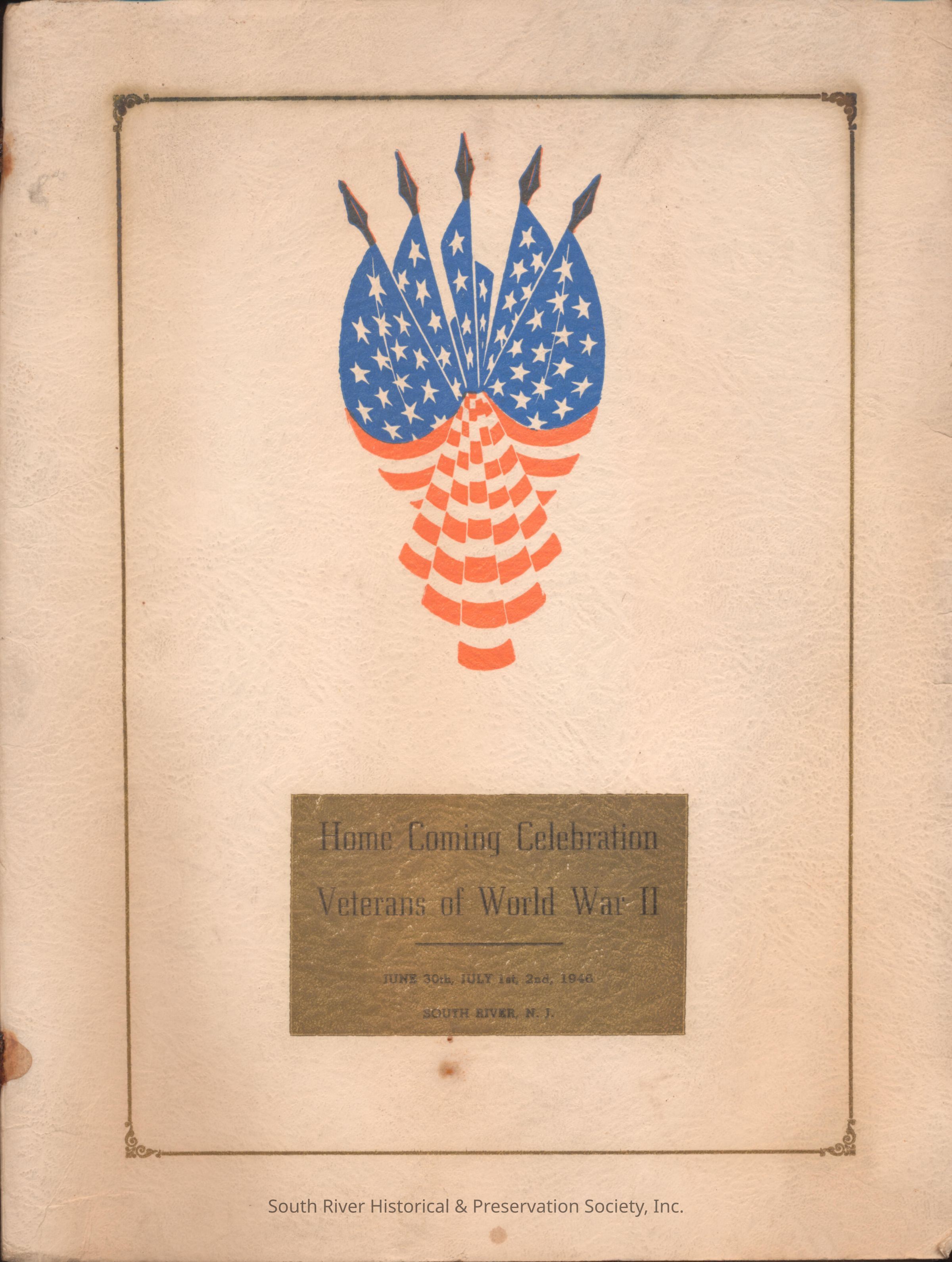 Souvenir booklet from the "Home Coming Celebration Veterans of World War II: June 30th, July 1st, 2nd, 1946 South River, N.J." The cover has a gold border, five flags centered together, and a gold box showing the title of the booklet which is repeated on the title page.