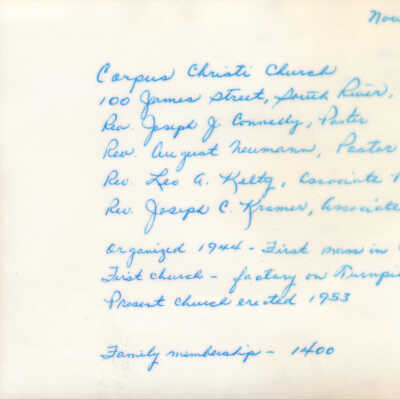 A note handwritten on the back in blue ink reads "November 1970; Corpus Christi Church, 100 James Street, South River, New Jersey; Rev. Joseph J. Connelly, Pastor, 1944-1970; Rev. August Neumann, Pastor, 1970 - ; Rev. Leo A. Kelty, Associate Pastor; Rev. Joseph C. Kramer, Associate Pastor; organized 1944 - First mass in Campbell School; First church - factory on Turnpike; Present church erected 1953; Family membership - 1400."