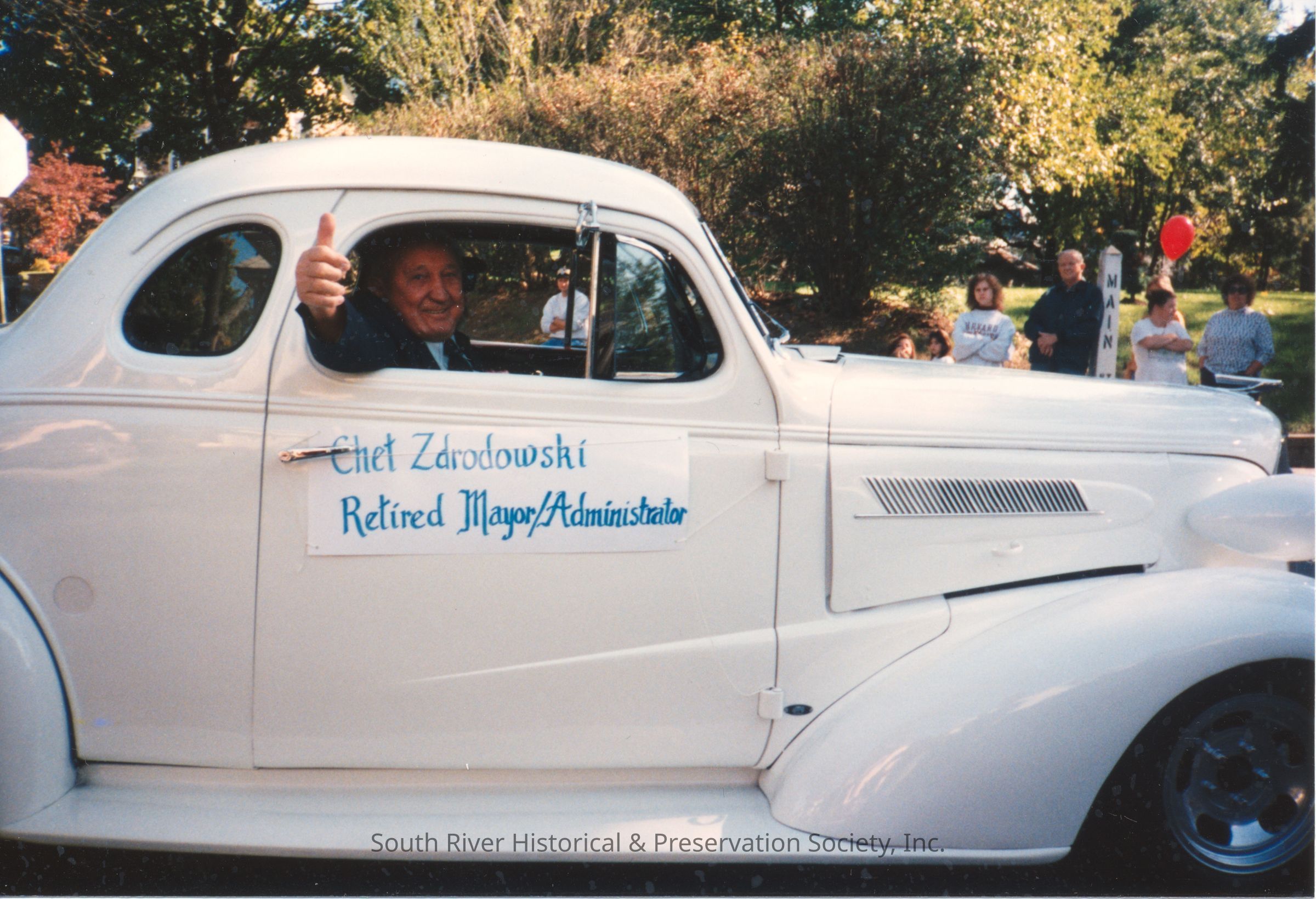 Color photograph former mayor/administrator Chet Zdrodowski in the parade for South River's 275th Anniversary on October 22, 1995. Zdrodowski is riding in a white antique automobile with a hand-lettered sign reading "Chet Zdrodowski, Retired Mayor/Administrator" on the side.
