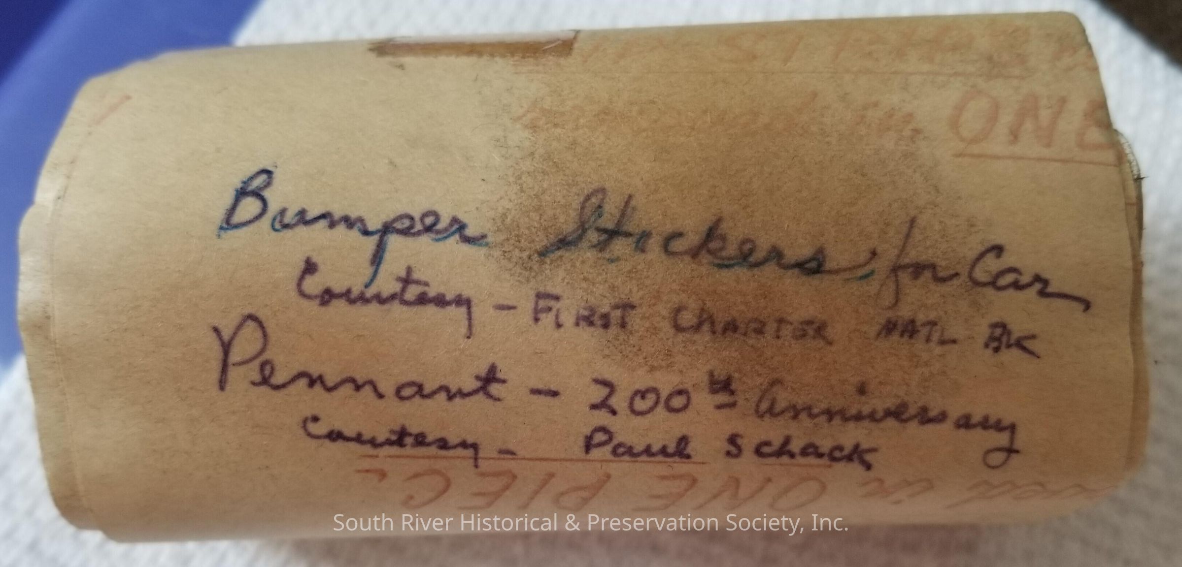 A handwritten note on the paper backing reads "Bumper Sticker for Car, Courtesy - First Charter Natl Bk; Pennant - 200th Anniversary, Courtesy - Paul Schack."