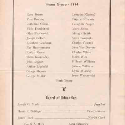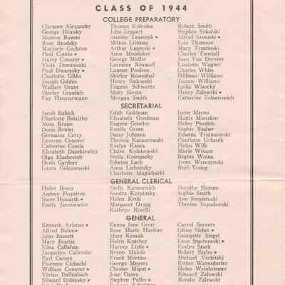 The inside of the leaflet includes a "Commencement Program" schedule, a list of members of the "National Honor Society," a list of members of the "Honor Group - 1944," and a list of the members of the "Board of Education." The back cover provides a list of graduates in the "Class of 1944" divided into categories by overall discipline: College Preparatory, Secretarial, General Clerical, General, Industrial Arts, and Home Economics.
