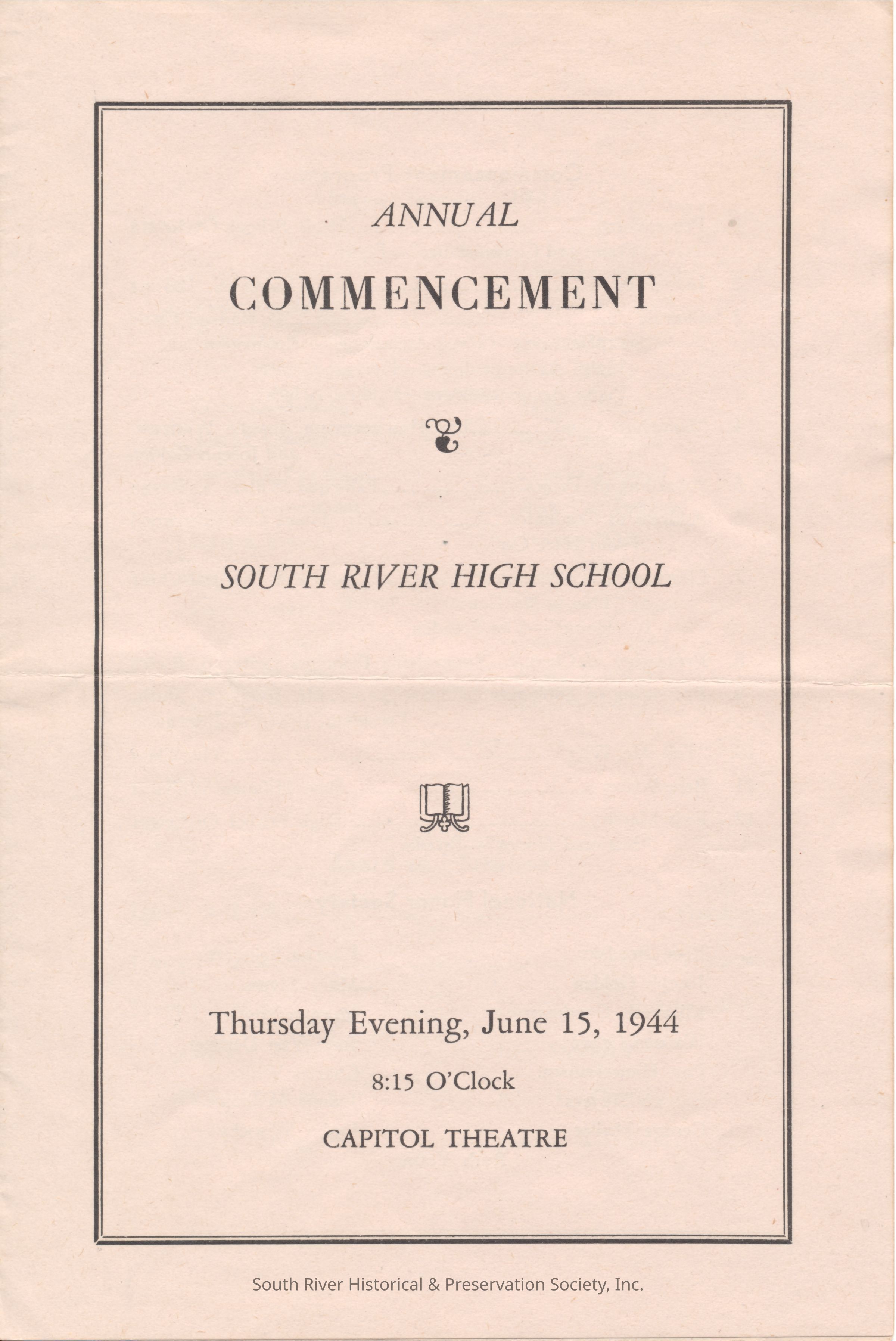 Commencement program with text on the front cover that reads, "Annual Commencement, South River High School, Thursday Evening, June 14, 1944, 8:15 O'Clock, Capitol Theatre."