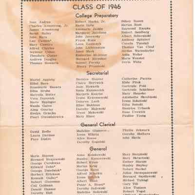 The inside of the leaflet includes a "Commencement Program" schedule, a list of members of the "National Honor Society," a list of members of the "Honor Group - 1946," and a list of the members of the "Board of Education." The back cover provides a list of graduates in the "Class of 1946" divided into categories by overall discipline: College Preparatory, Secretarial, General Clerical, General, Industrial Arts, and Home Economics.