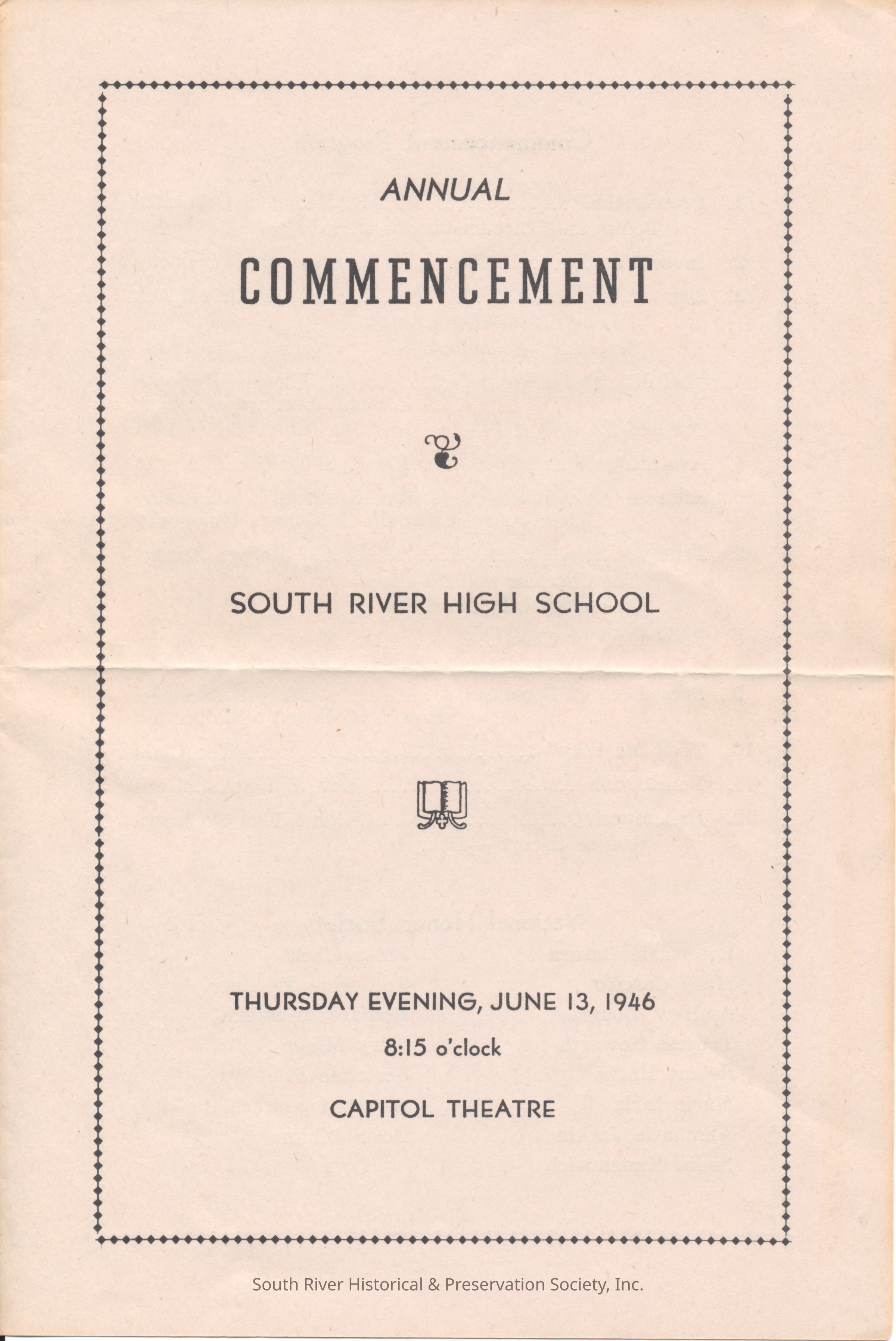 Commencement program with text on the front cover that reads, "Annual Commencement, South River High School, Thursday Evening, June 13, 1946, 8:15 O'Clock, Capitol Theatre."