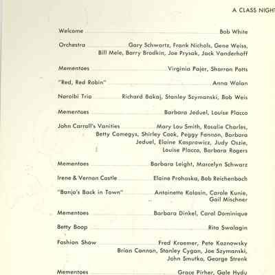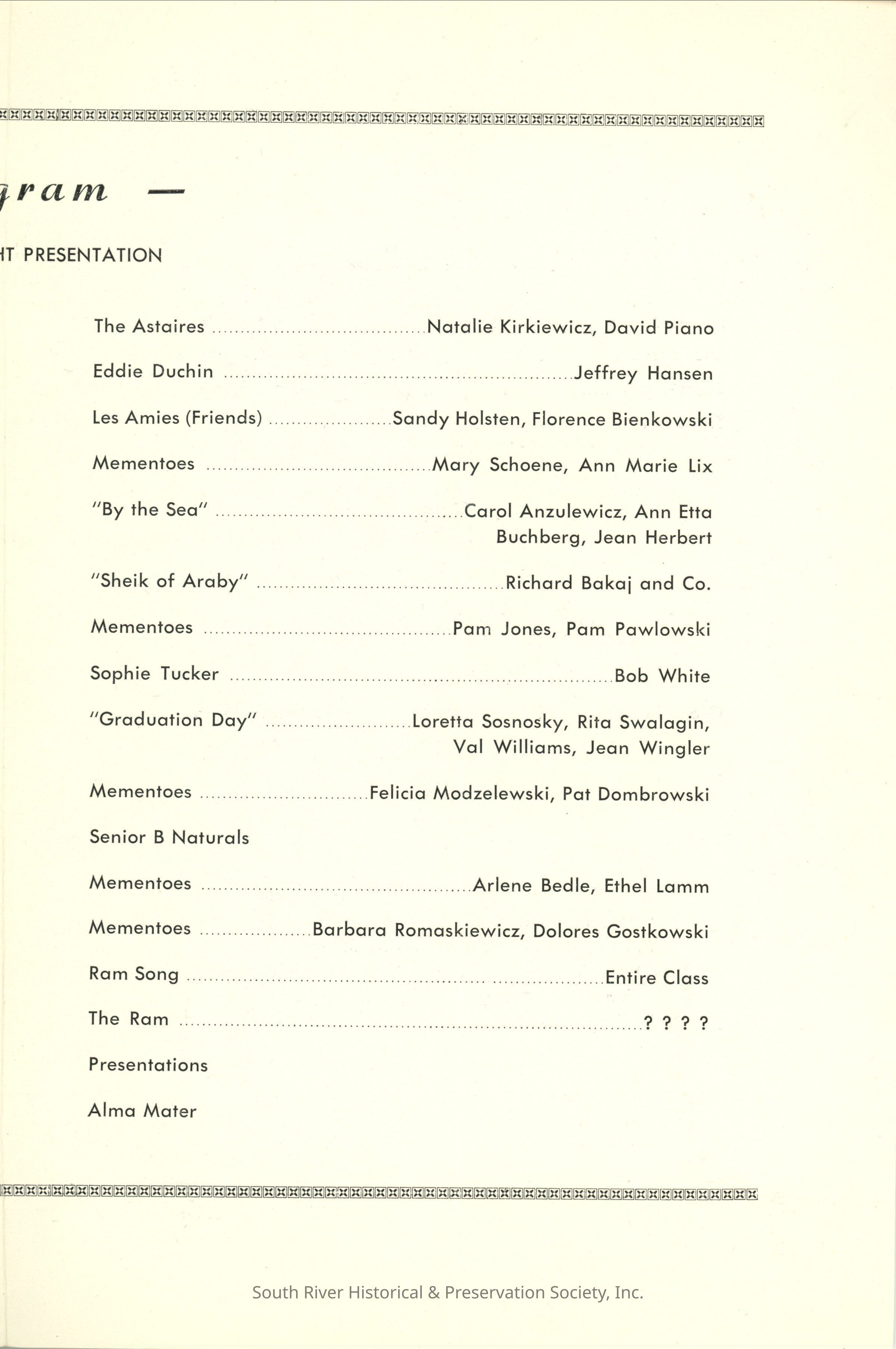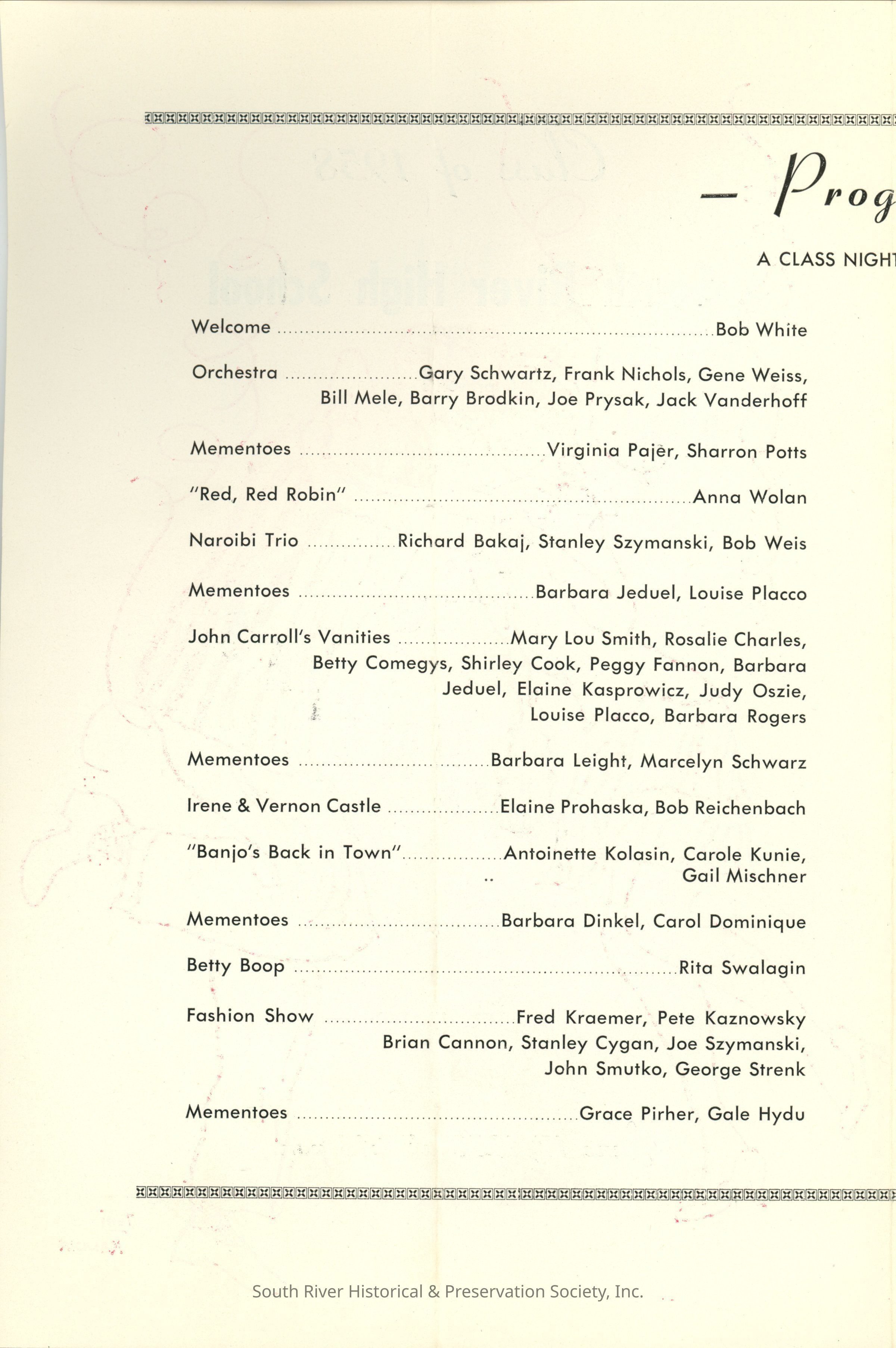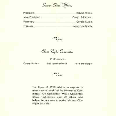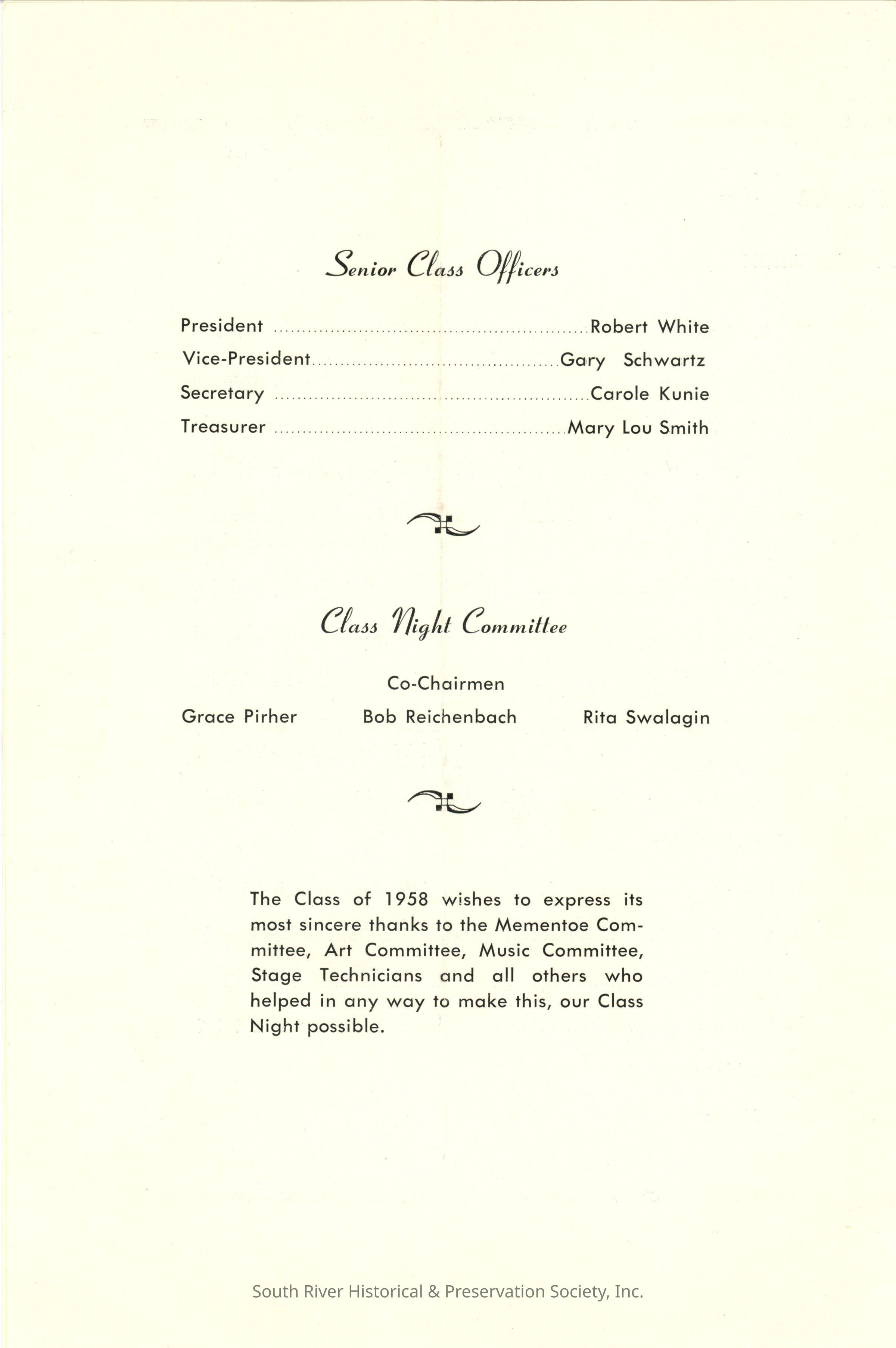 Program for the 1958 South River High School Class Night event presented by members of the graduating class and held on June 17, 1958 at the Capitol Theatre.
