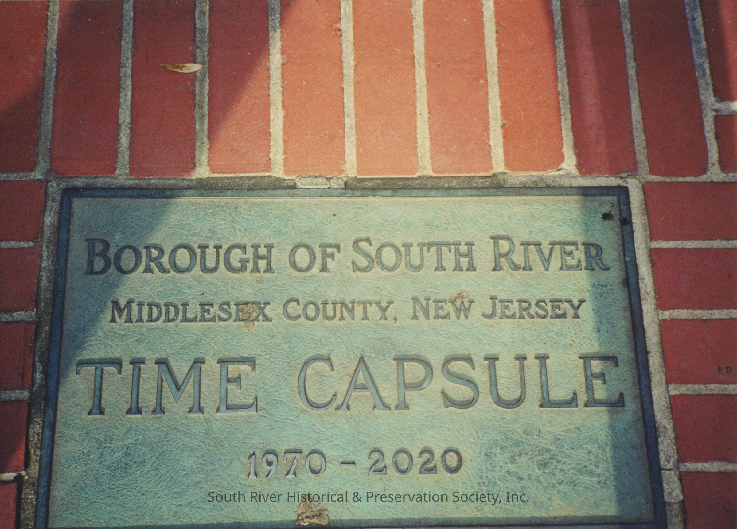 The plaque reads, "Borough of South River, Middlesex County, New Jersey, Time Capsule, 1970-2020"