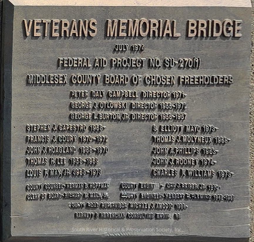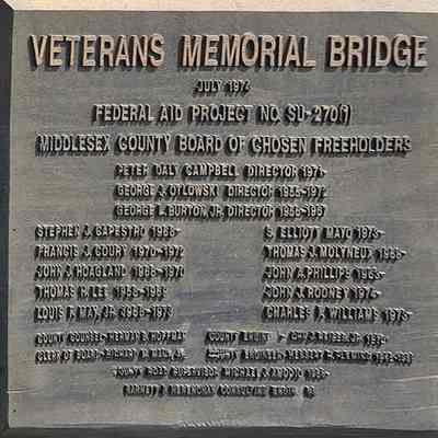 Digital color photograph of the plaque on the Veterans Memorial Bridge taken from the sidewalk on the opposite side of the roadway. The plaque reads, "Veterans Memorial Bridge, July 1974, Federal Aid Project No. SU-270(1); Middlesex County Board of Chose Freeholders..." Plaque lists the names of the members of the Board of Chosen Freeholders throughout the planning years for the bridge. The County Council, Clerk of Board, County Engineers, County Road Supervisor, and the consulting engineers are also acknowledged.Photograph Details