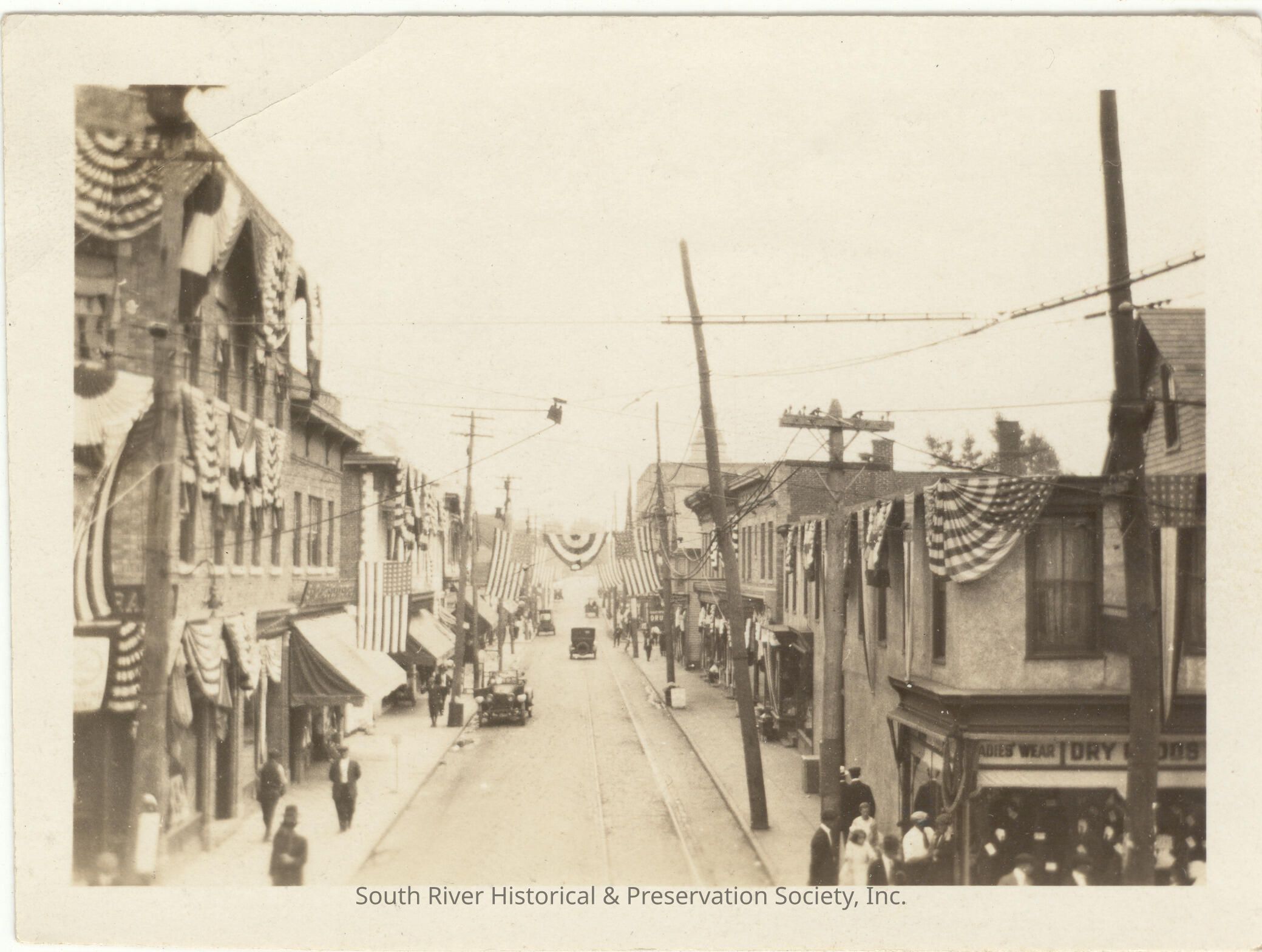 Photograph of Ferry Street decorated with banners and bunting. May have been taken from the balcony of Jacob Levinson's store/house on Main Street. Thought to be from celebration of South River's 200th anniversary in 1920, but may be from 1919 welcome home celebration for returning soldiers.