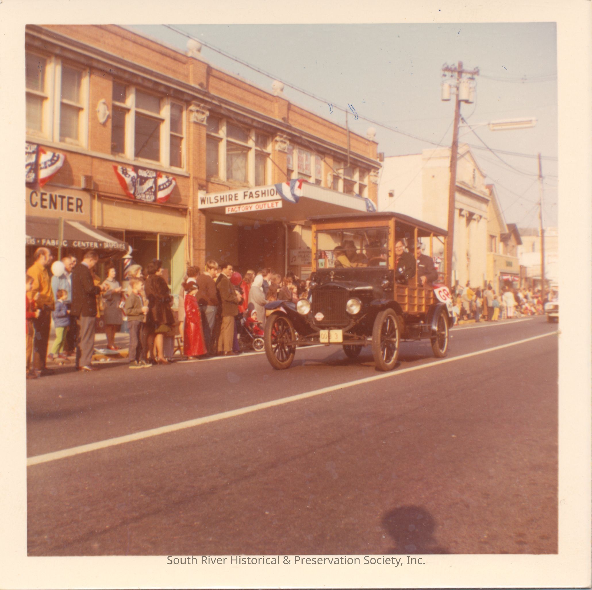 Photograph of an antique automobile hosting the grand marshals being driven in the parade held for the celebration of South River's 250th anniversary in 1970. The grand marshals were Walter Schack and Mary Serafin.