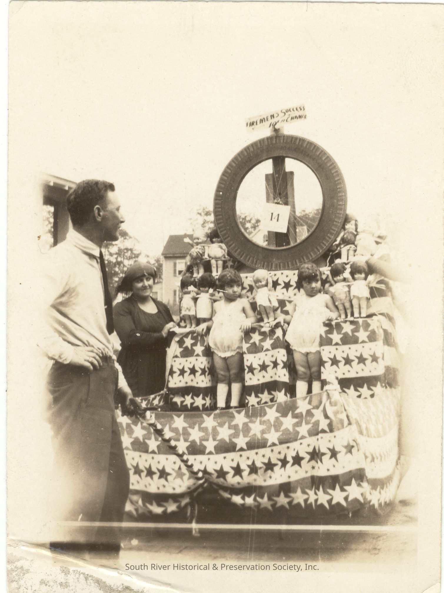 Photograph of the "Firemen's Success" float from the baby parade during the celebration of South River's 200th anniversary in 1920. People in the photograph are unidentified. Scanned digital copy of print photograph.