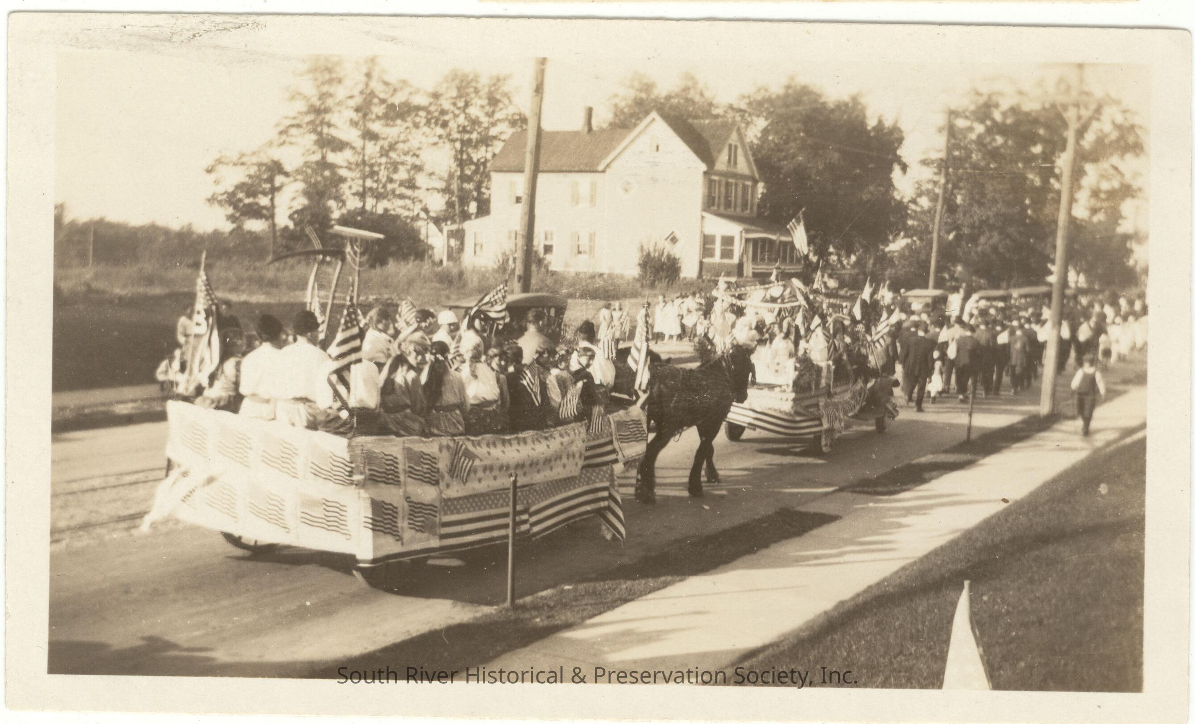 Unidentified groups walking and riding in decorated drays on Main Street during the parade for South River's 200th anniversary in September 1920. Scanned digital copy of print photograph.