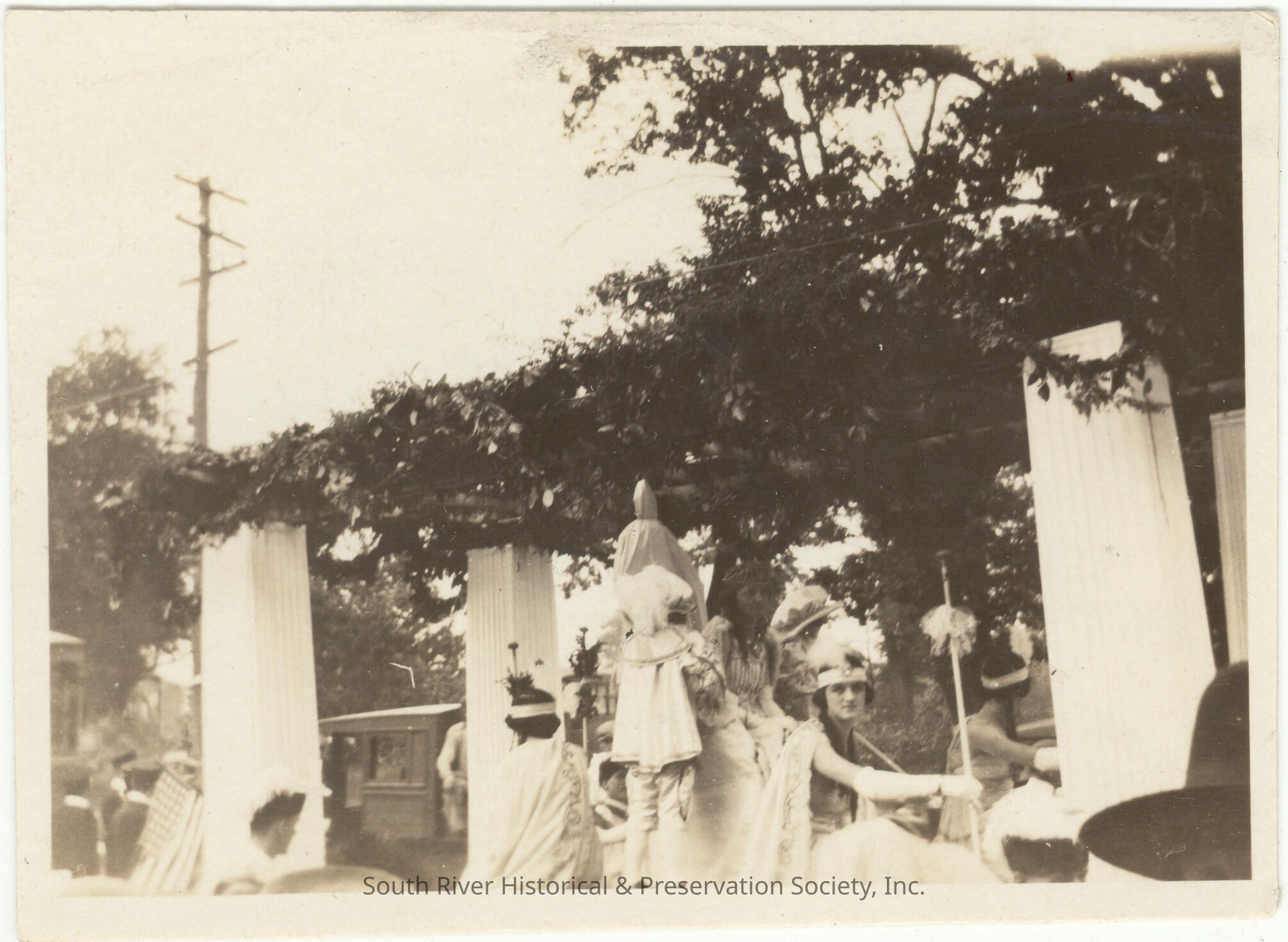 Photograph of Queen Riverie and her attendants on her float during the parade for the celebration of South River's 200th anniversary, September 1920. Eva Bissett was Queen Riverie. Scanned digital copy of print photograph.