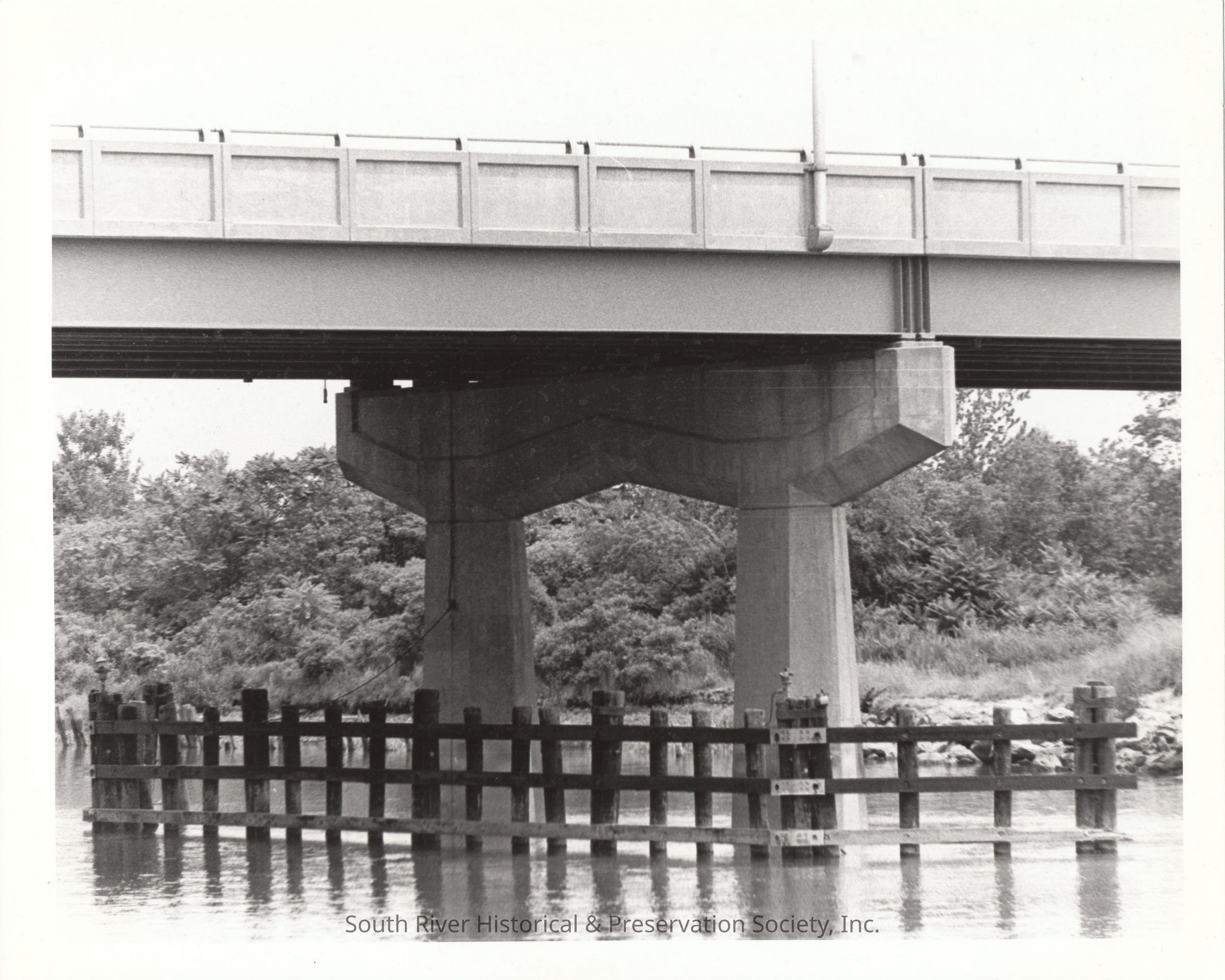 Black and white photograph of a support piling for the Veterans Memorial Bridge between South River and Sayreville. The back of the photograph is blank. Measures 8"x 10".