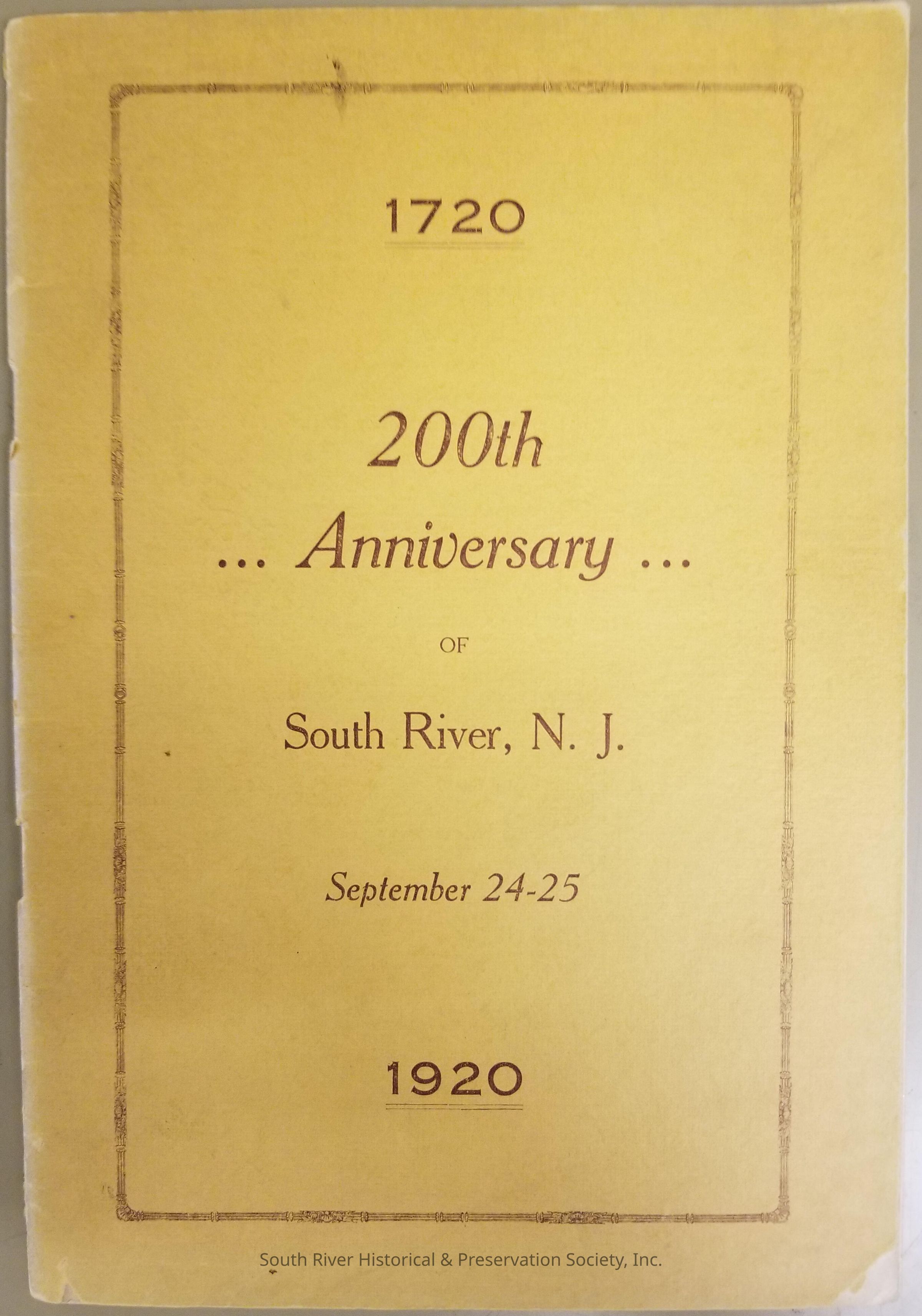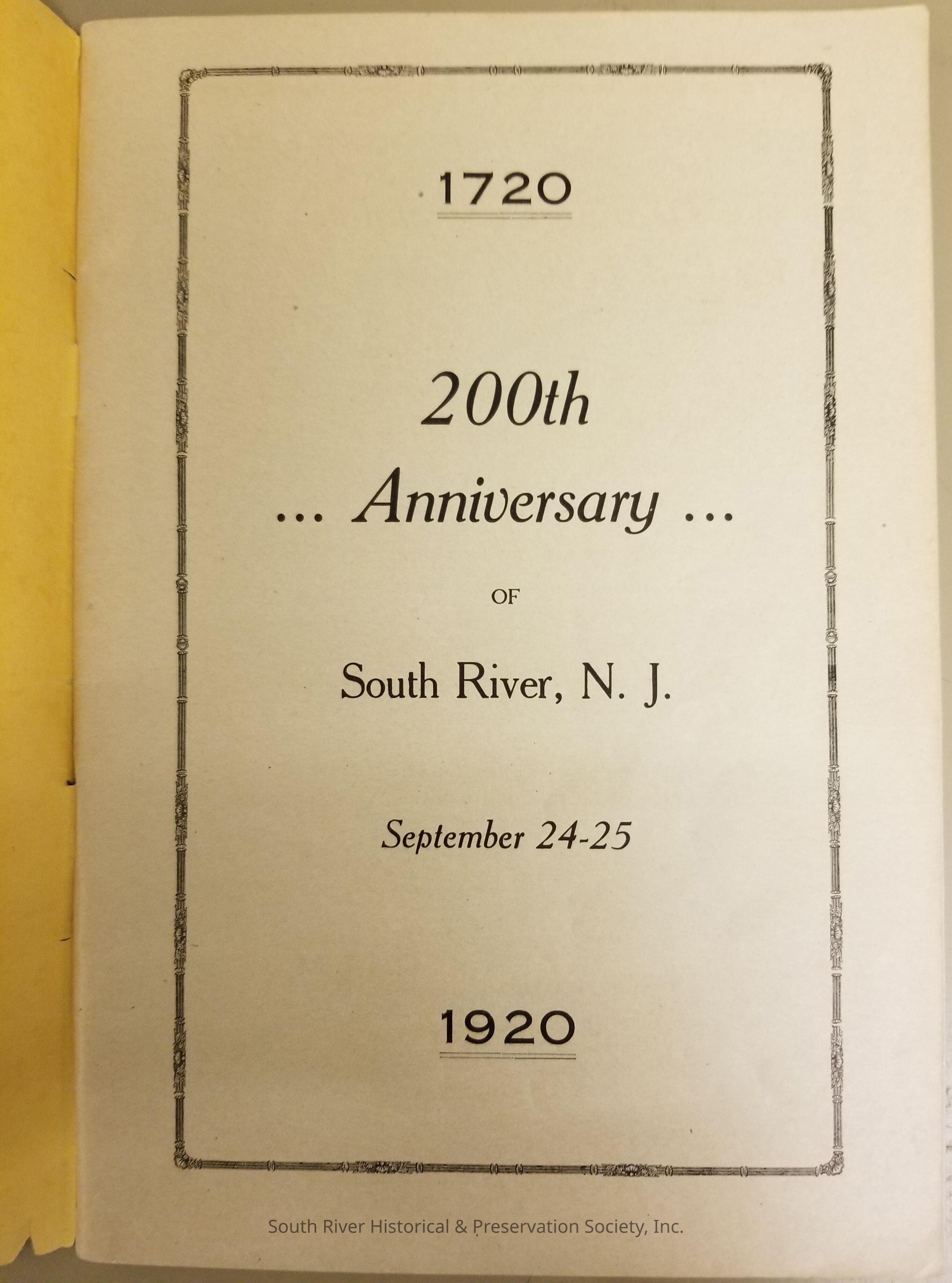 Booklet printed for the celebration of the 200th Anniversary of South River September 24 and 25, 1920. The cover is dark yellow with text reading "1720 -- 200th Anniversary of South River, N.J., September 24-25, 1920". Text on the back cover reads "Spokesman Print, South River, N.J." Information in the program includes schedule of events, history, photographs, advertisements, lists of descendants, and an "honor roll" list.