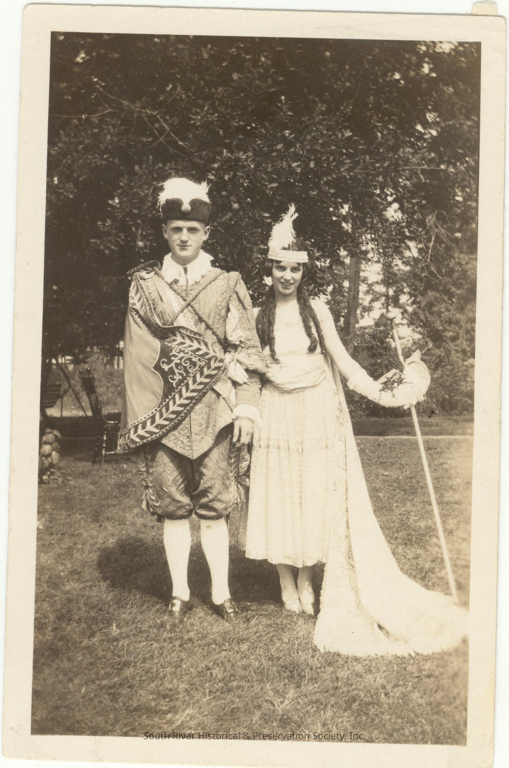 Photograph of two of Queen Reverie's attendants during the celebration of South River's 200th anniversary, September 1920. Male and female attendant are unidentified. Scanned digital copy of print photograph.