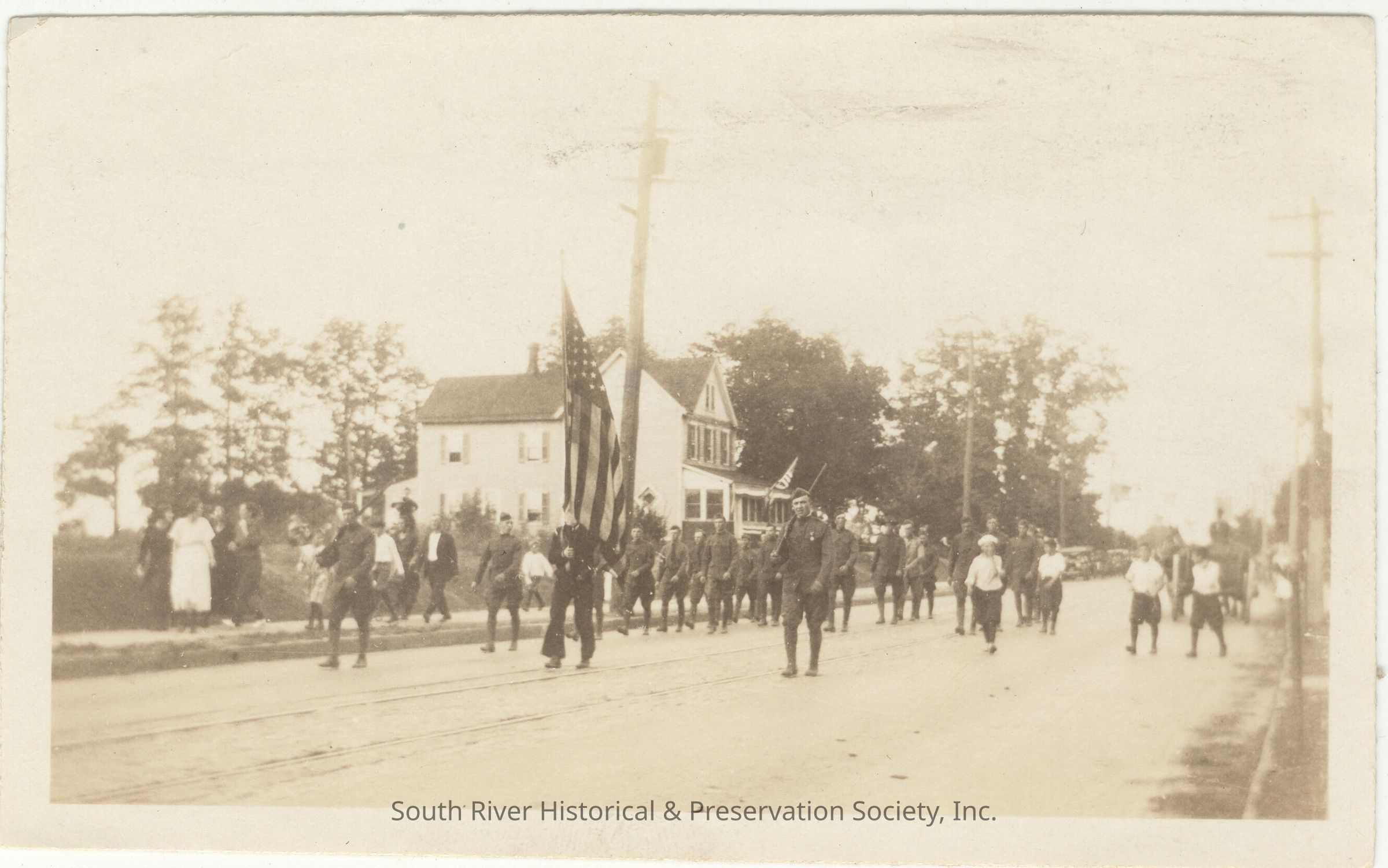 Photograph of a group of soldiers on Main Street in the parade for the celebration of South River's 200th anniversary, September 1920. Scanned digital copy of print photograph.
