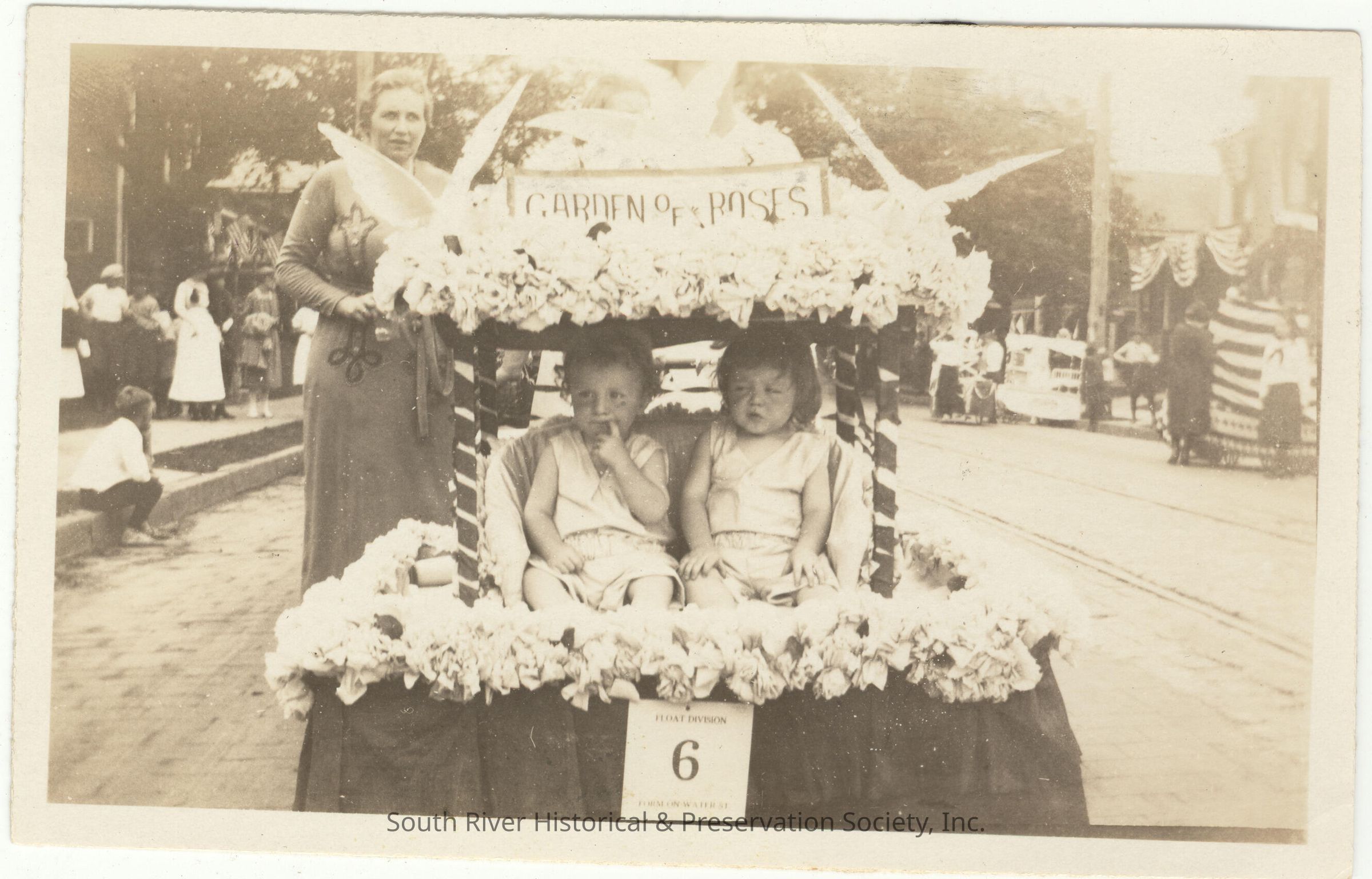 Photograph of entry number 6 from the baby parade for South River's 200th anniversary in September 1920. The float is titled "Garden of Roses." Two children are surrounded by roses under and roof covered with roses and birds. A woman stands at the rear.
