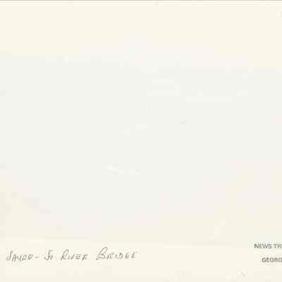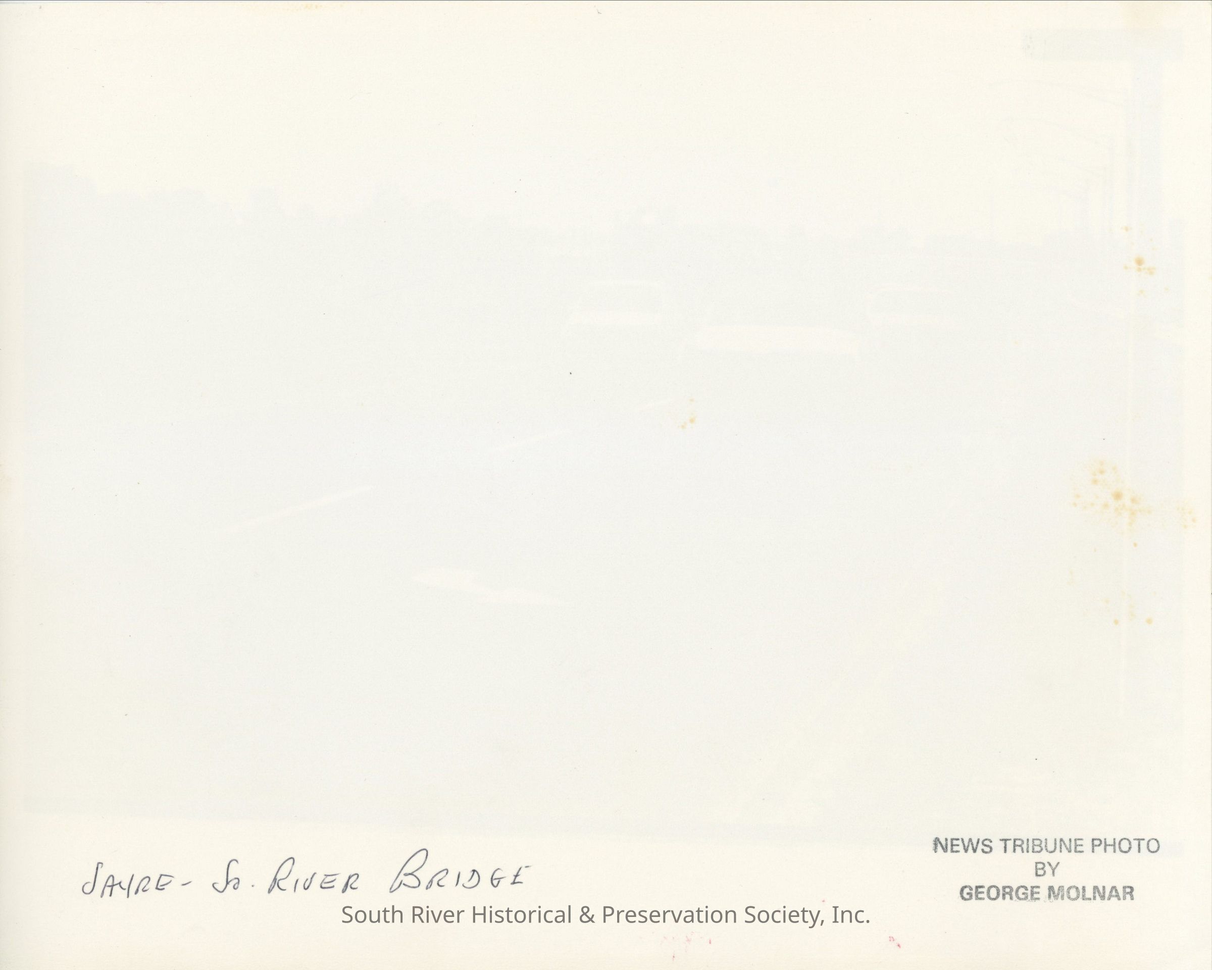 The back of the photograph has a handwritten note that reads, "Sayre - So. River Bridge." "News Tribune Photo by George Molnar" is also stamped on the back.