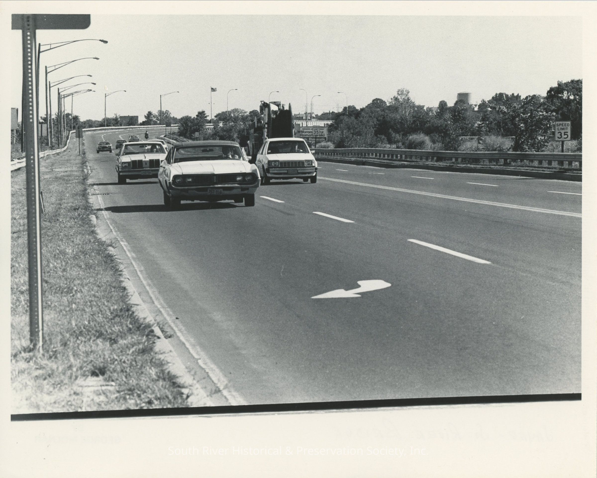 Black and white photograph of vehicles traveling on the new bridge after its opening on July 24, 1974. The view is from near the South River end looking toward Sayreville. Two speed limit signs and a political advertisement for Democrats Woronowicz and Romatowski are visible.