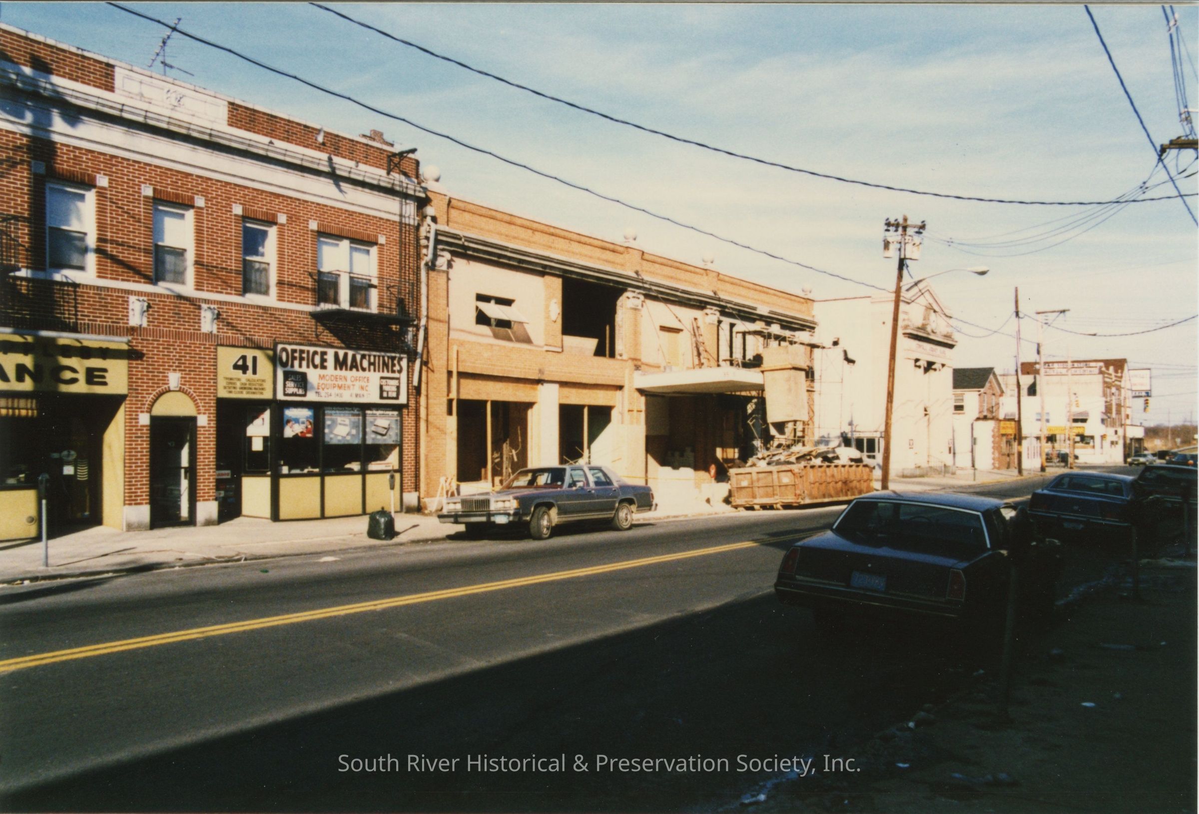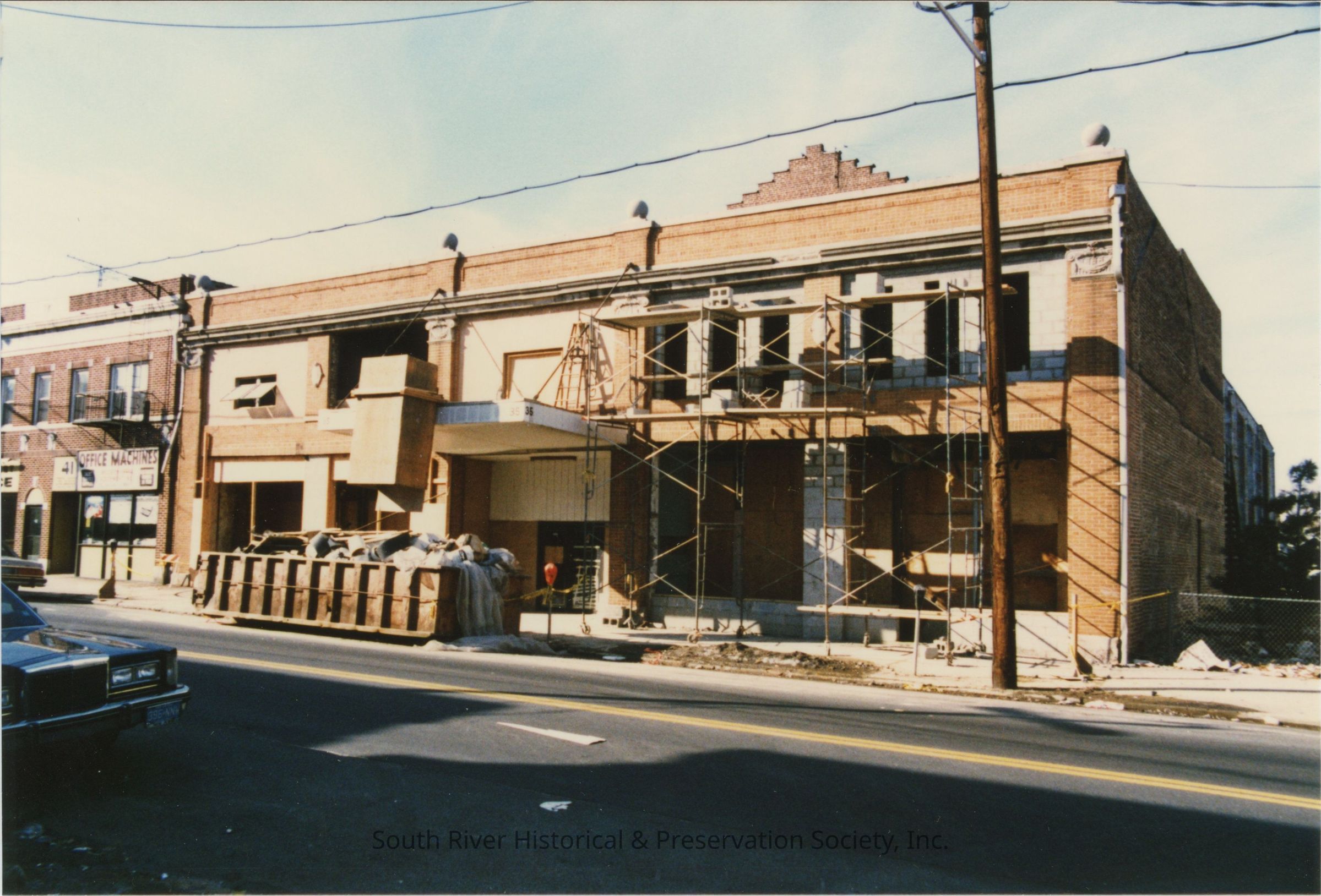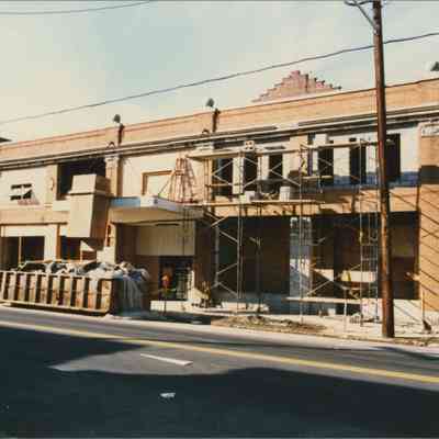 Two color photographs of the Wilshire Fashions building, originally the Capitol Theatre, being renovated in January 1988. One photograph shows Modern Office Equipment, Inc. at 41 Main Street along with a portion of the insurance office in the same building. The bank building and others as far down as Laffin are also visible beyond the building under construction.