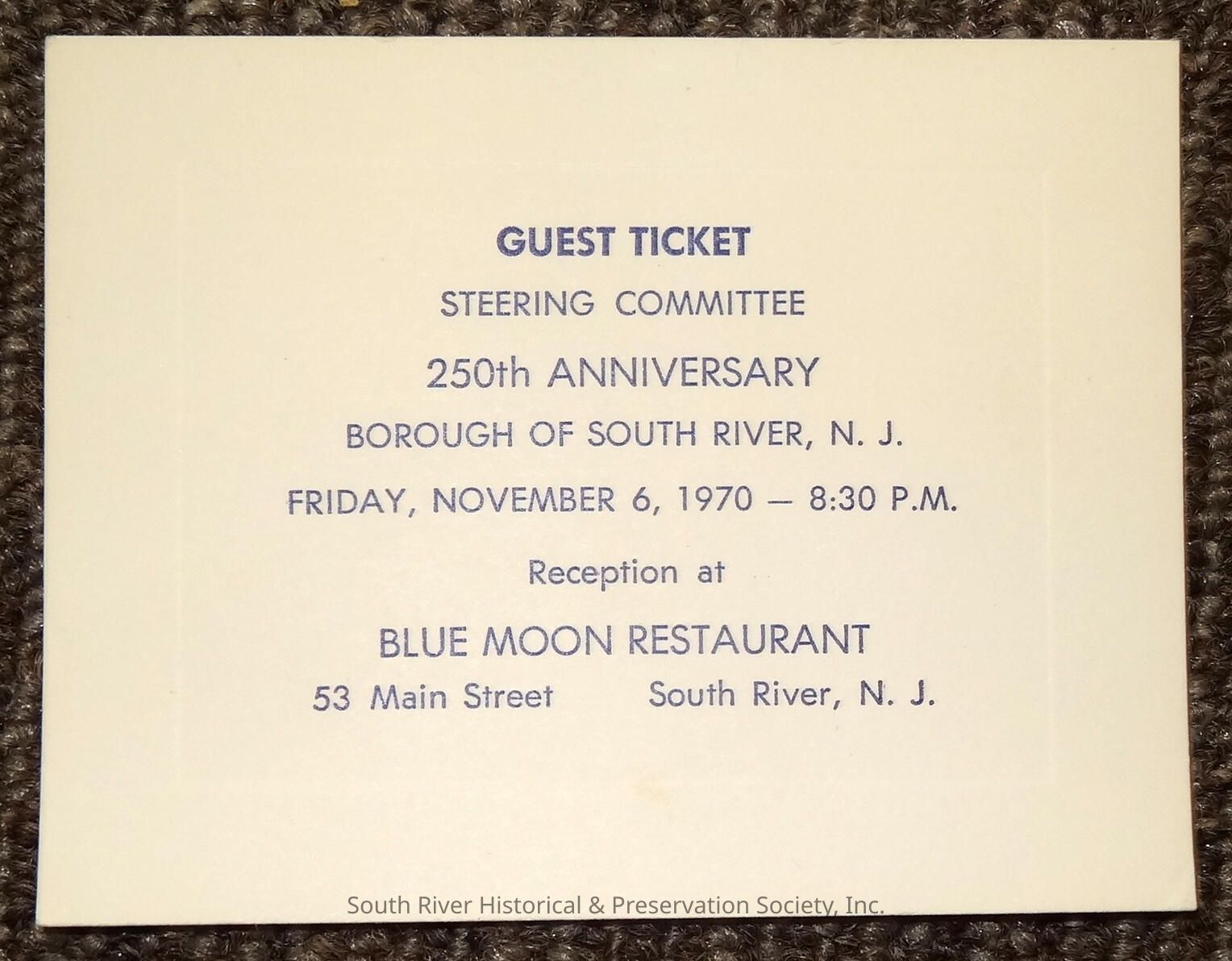 Two (2) guest tickets for the Steering Committee reception dinner for the 250th Anniversary celebration for South River, N.J. Ticket has an embossed border and text printed in blue ink reading: "Guest Ticket/Steering Committee, 250th Anniversary, Borough of South River, N.J., Friday, November 6, 1970 - 8:30 P.M. Reception at Blue Moon Restaurant, 53 Main Street South River, N.J." Both tickets are in excellent condition with very minor creasing along edges and no other creases, tears, or stains. One ticket has four small dents in the back. Tickets measure 3 1/4" X 4 1/4".Acquisition