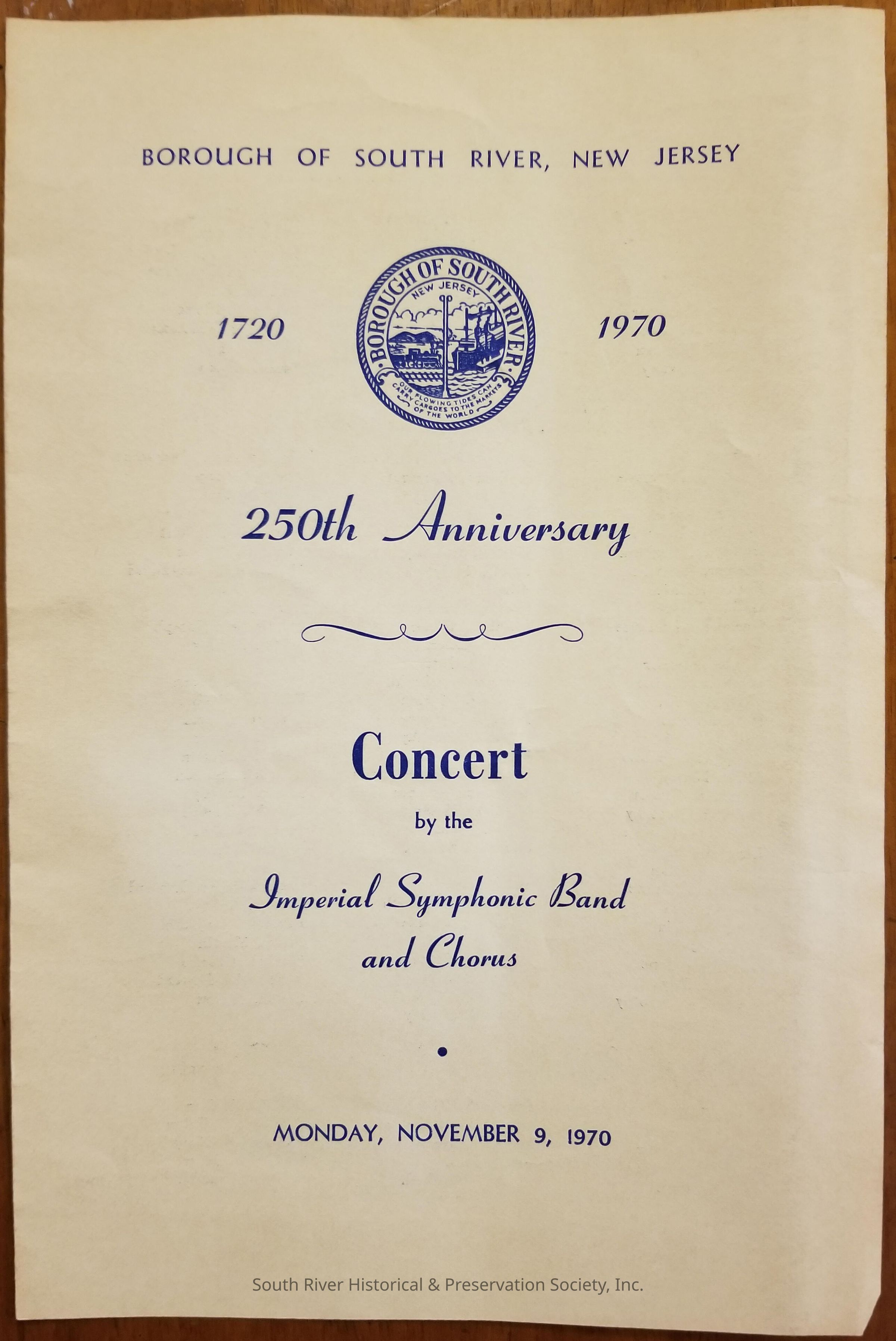 Program for the Imperial Symphonic Band and Chorus concert in celebration of the 250th anniversary of South River. The seal of South River appears on the front cover with text reading: "Borough of South River, New Jersey; 1720 1970; 250th Anniversary -- Concert by the Imperial Symphonic Band and Chorus, Monday, November 9, 1970."