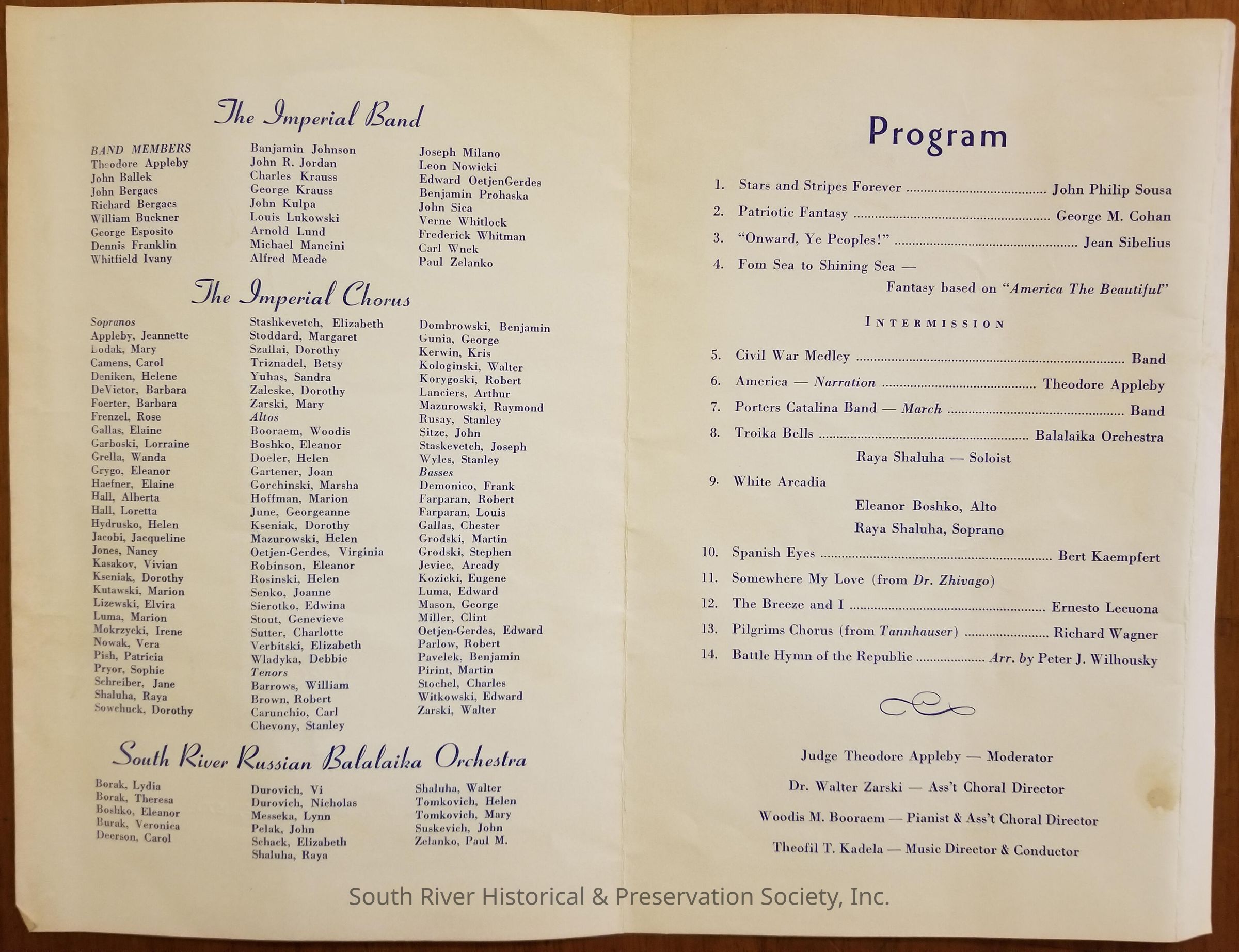 Appleby, Theodore, Zarski, Walter (Dr.), Booraem, Woodis M., Kadela, Theofil T., Imperial Band, Imperial Chorus, South River Russian Balalaika Orchestra