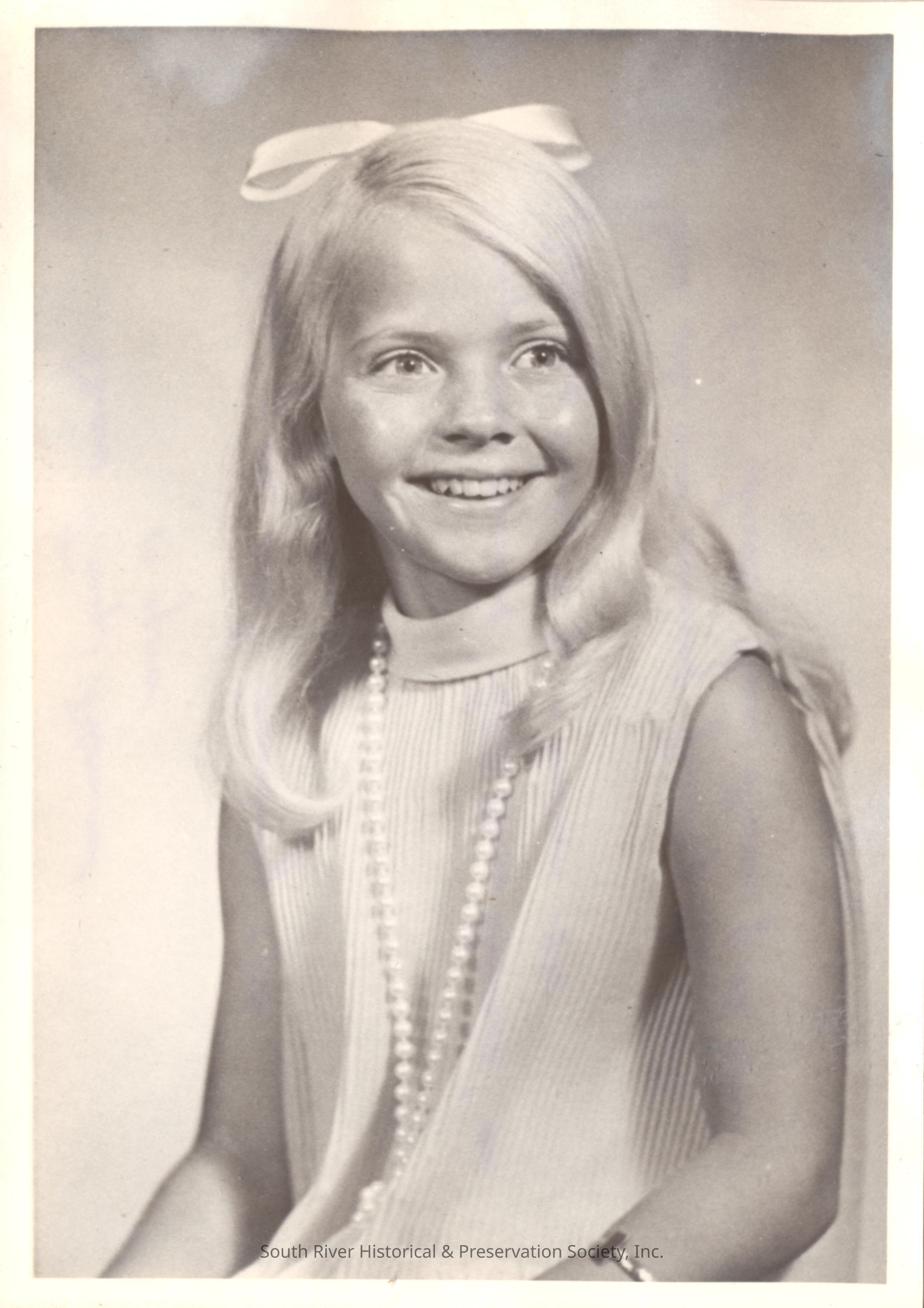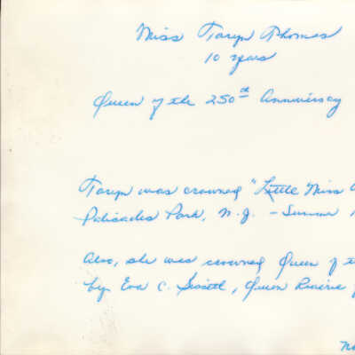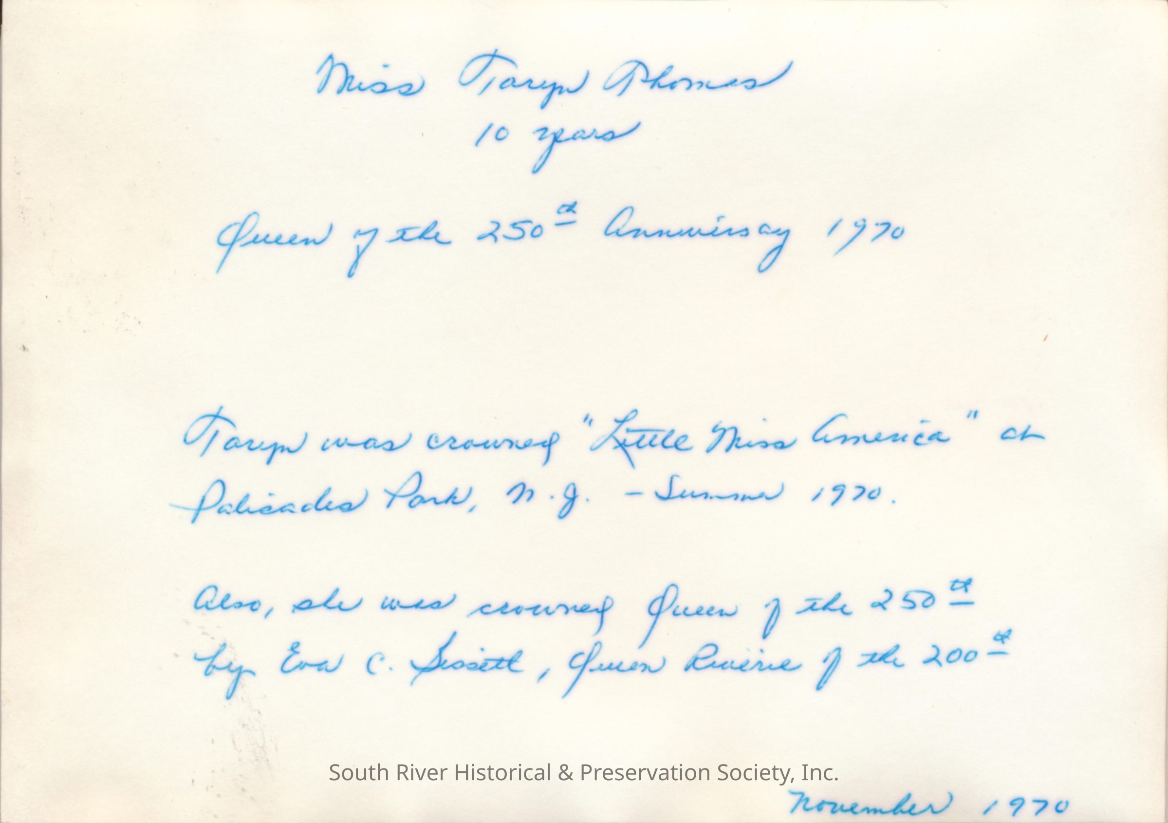 A note handwritten on the back in blue ink reads "'Miss Taryn Thomas, 10 years; Queen of the 250th Anniversary 1970; Taryn was crowned Little Miss America at Palisades Park, N.J. - Summer 1970. Also, she was crowned Queen of the 250th by Eva C. Bissett, Queen Riverie of the 200th; November 1970."