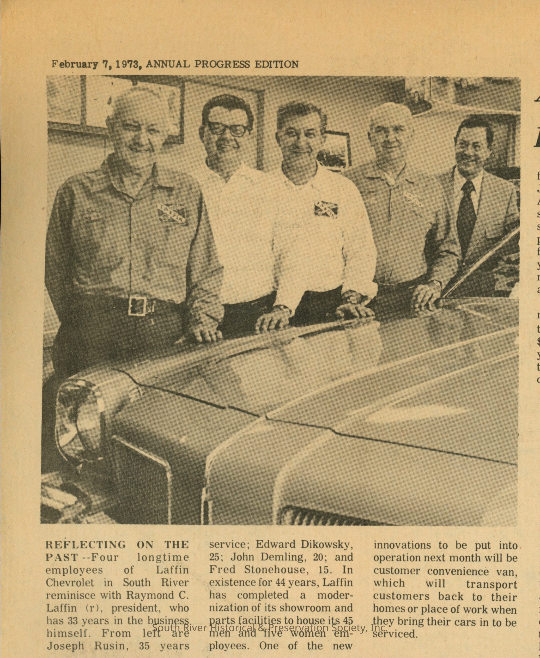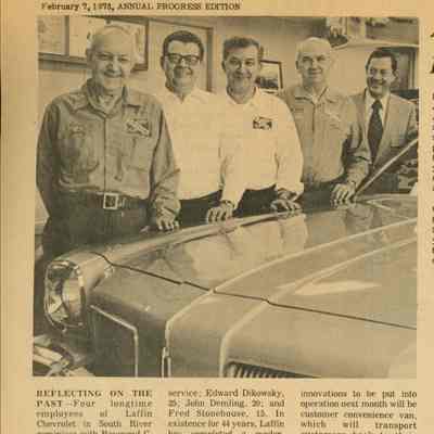 Part of the February 7, 1973 "Annual Progress Edition" of an unidentified newspaper. Includes two folded sheets [4 pages each] and one single sheets [2 pages]. Only pages 13 and 18 are numbered. The publication is devoted to progress in towns in Middlesex County. Page [14] features a photograph about Laffin Chevrolet while page 18 features bridge history. The remainder of the articles focus on other towns in Middlesex County along with advertisements for area businesses.Acquisition