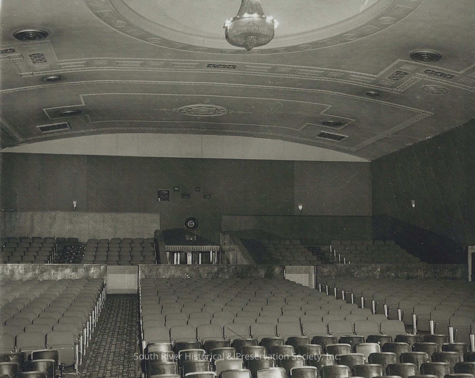 Digital copy of a black and white photograph of the auditorium of the Capitol Theatre on Main Street. The view is towards the back of the room from the stage. The entrance doors are visible below a clock. The seating slopes downward toward the front and a low dividing wall separates the main seating area from the stadium seating nearer the entrance. The center of the ceiling is domed with a crystal chandelier suspended from the center.