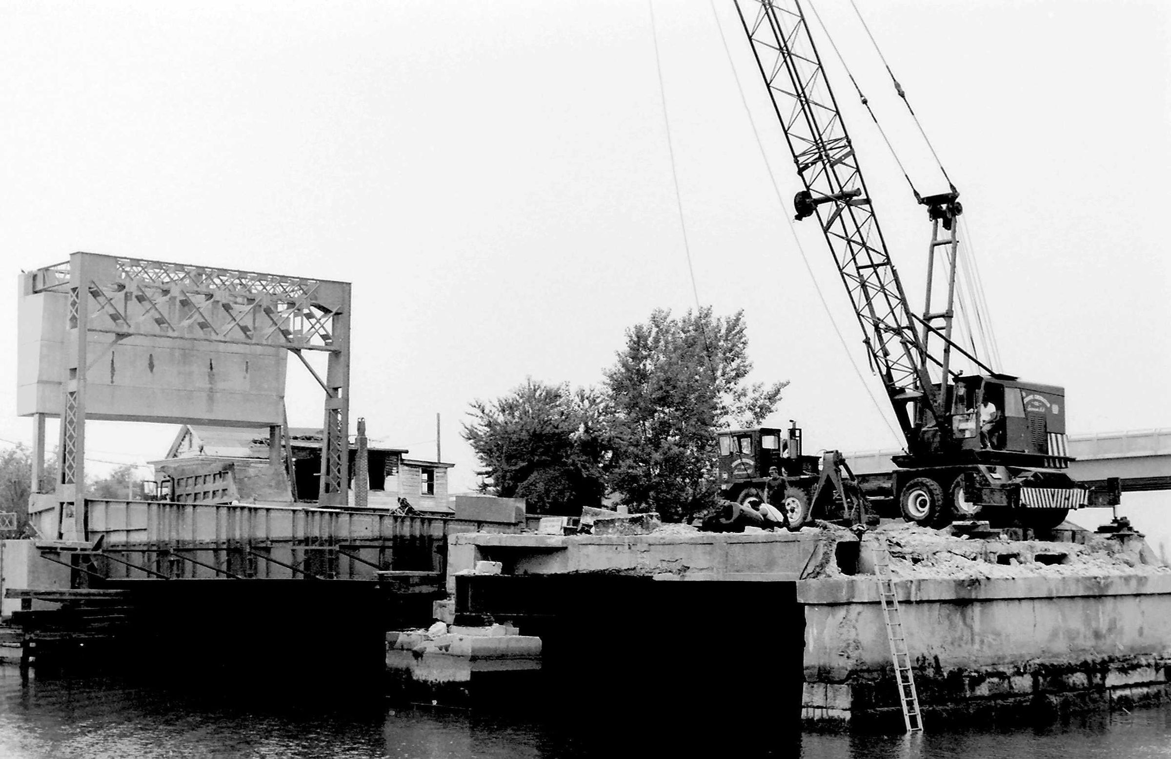 Black and white photograph of the Causeway bridge being dismantled after the opening of the new bridge in July 1974. The bridge counterweight is prominent at the left with buildings on the South River end of the bridge just visible in the background.