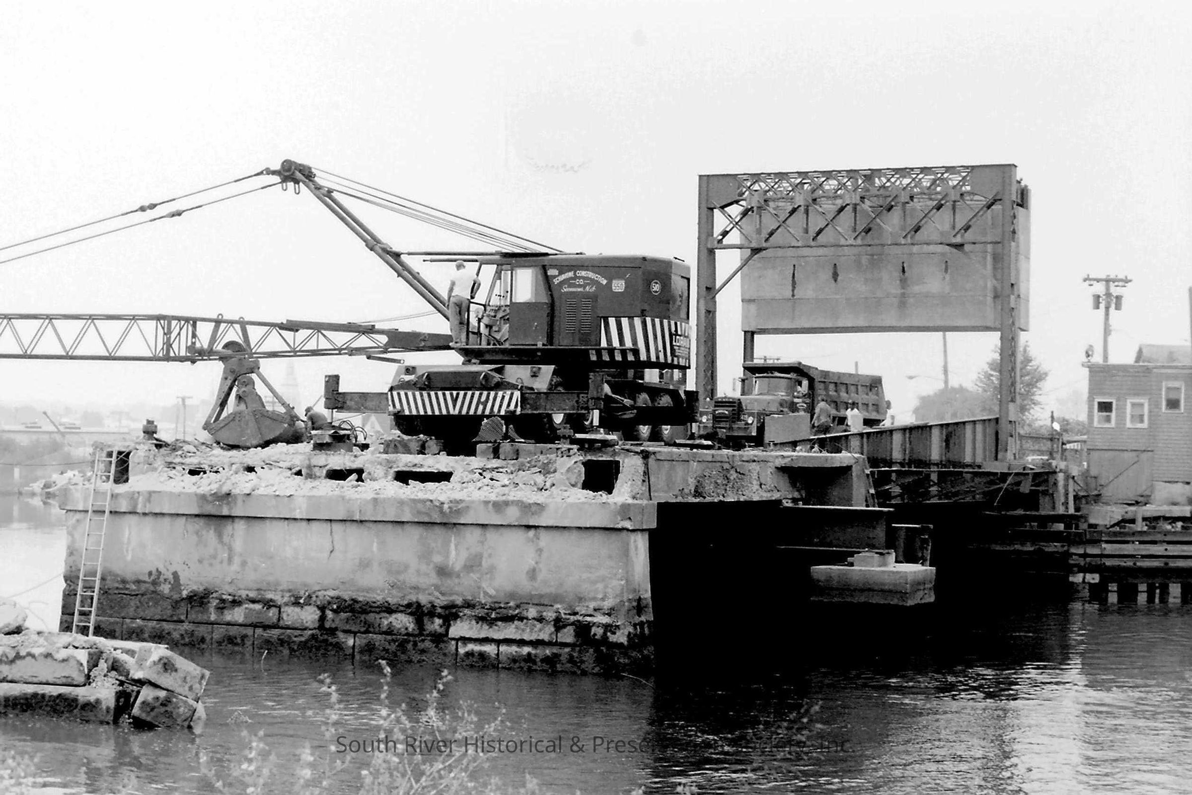 Black and white photograph taken during the dismantling of the Causeway bridge after the opening of the new bridge in July 1974. A construction crane sits on a section of the bridge in the foreground. The bridge counterweight is prominent at the right with a small building on the South River end of the bridge visible at the edge of the image.