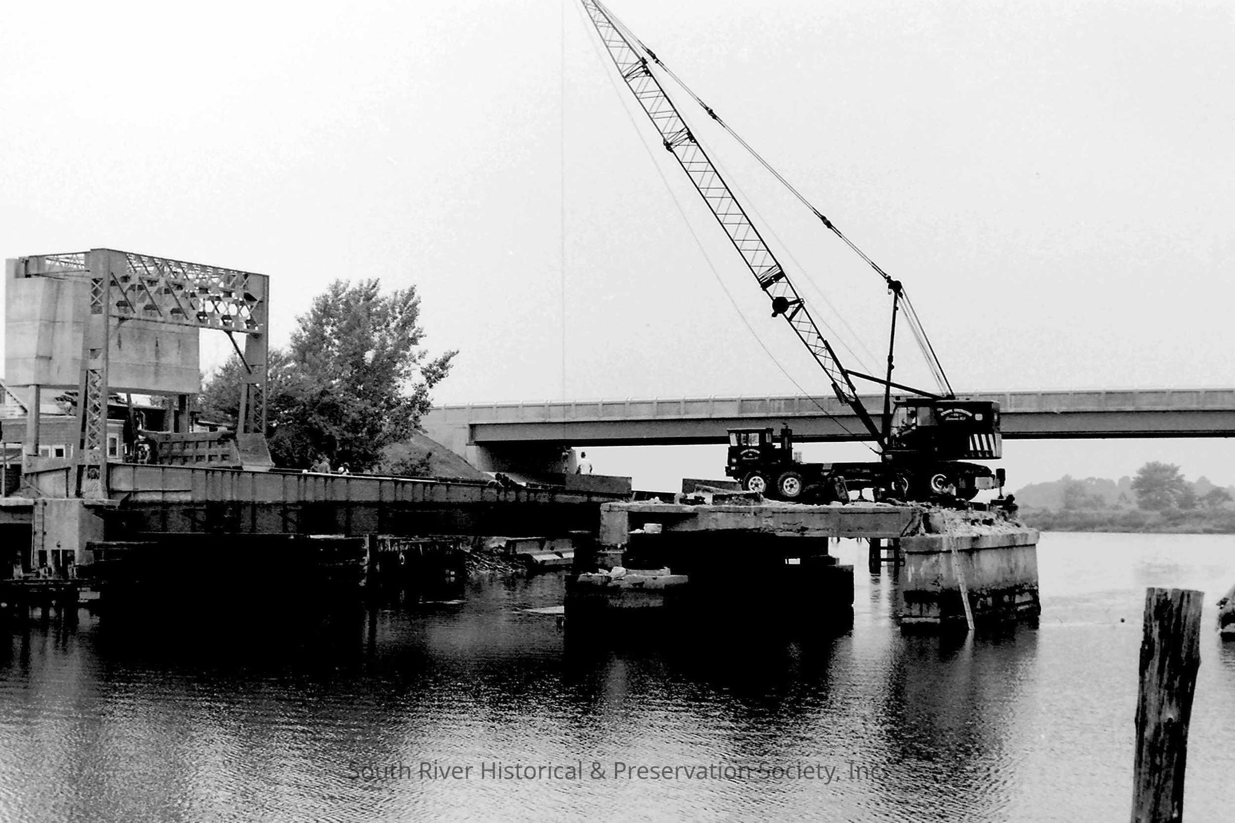 Black and white photograph taken during the dismantling of the Causeway bridge after the opening of the new bridge in July 1974. A portion of the bridge with the bridge counterweight prominent and a construction crane are in the foreground. The new bridge is in the background.