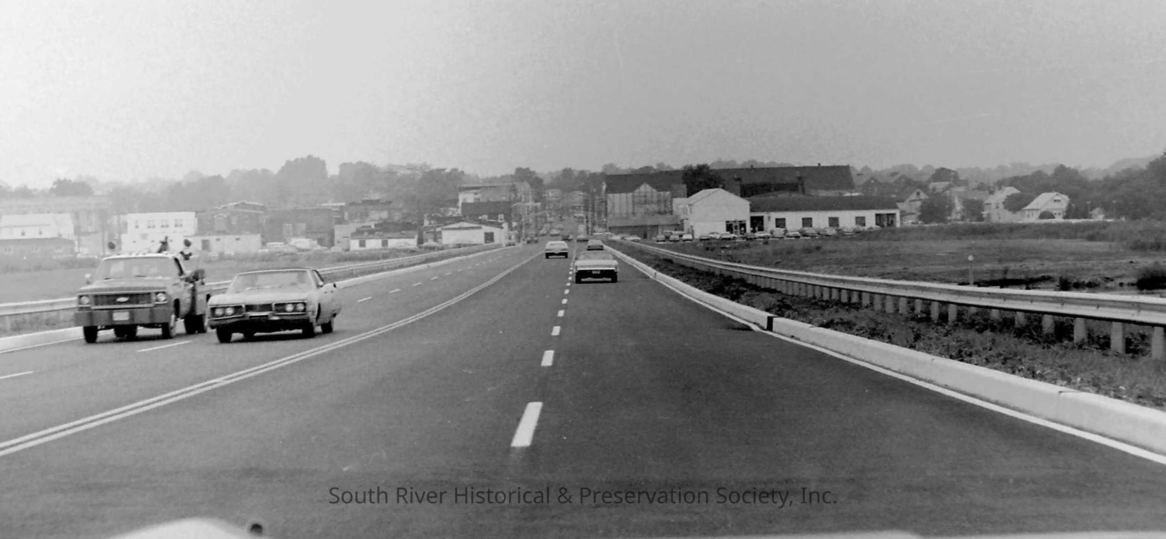 Photograph shows cars traveling on the Veterans Memorial Bridge shortly after it opened in 1974. View is looking into South River.