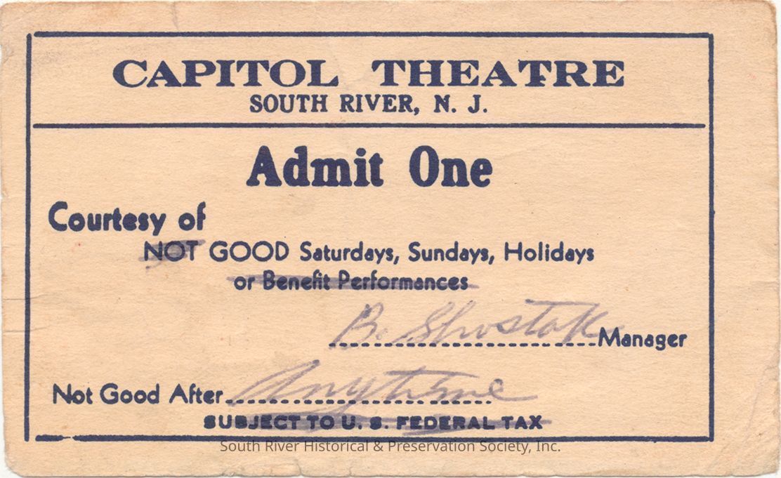 Ticket from the Capitol Theatre, South River, NJ . Ticket is printed on light tan cardstock and has text that reads, "Capitol Theatre, South River, N.J., Admit One, Courtesy of..., Not (crossed out) Good Saturdays, Sundays, Holidays, or Benefit Performances (crossed out).Manager, Not Good After, Subject to U.S. Federal Tax (crossed out)".
