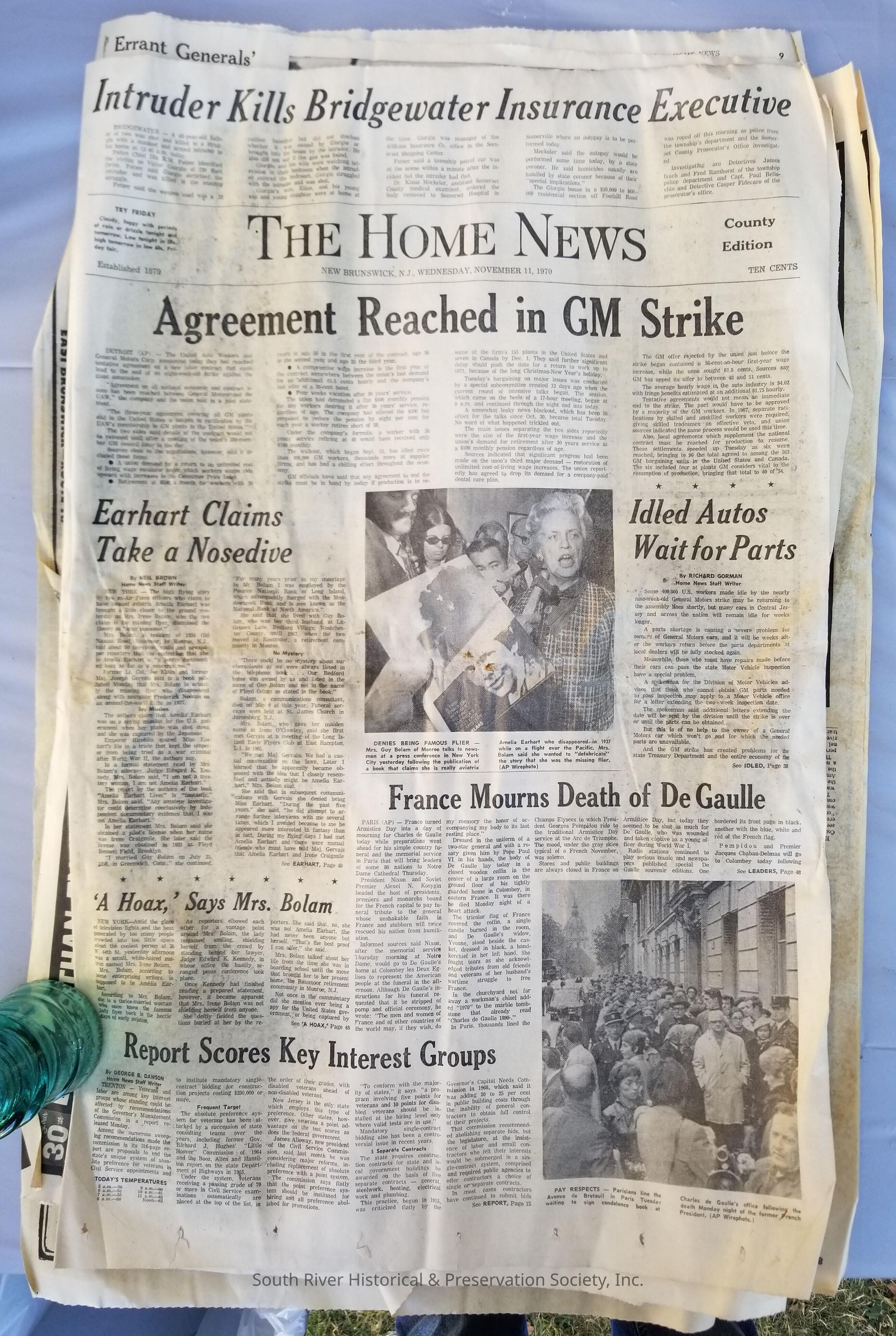 November 11, 1970 issue of The Home News newspaper. Poor condition with extensive water damage.