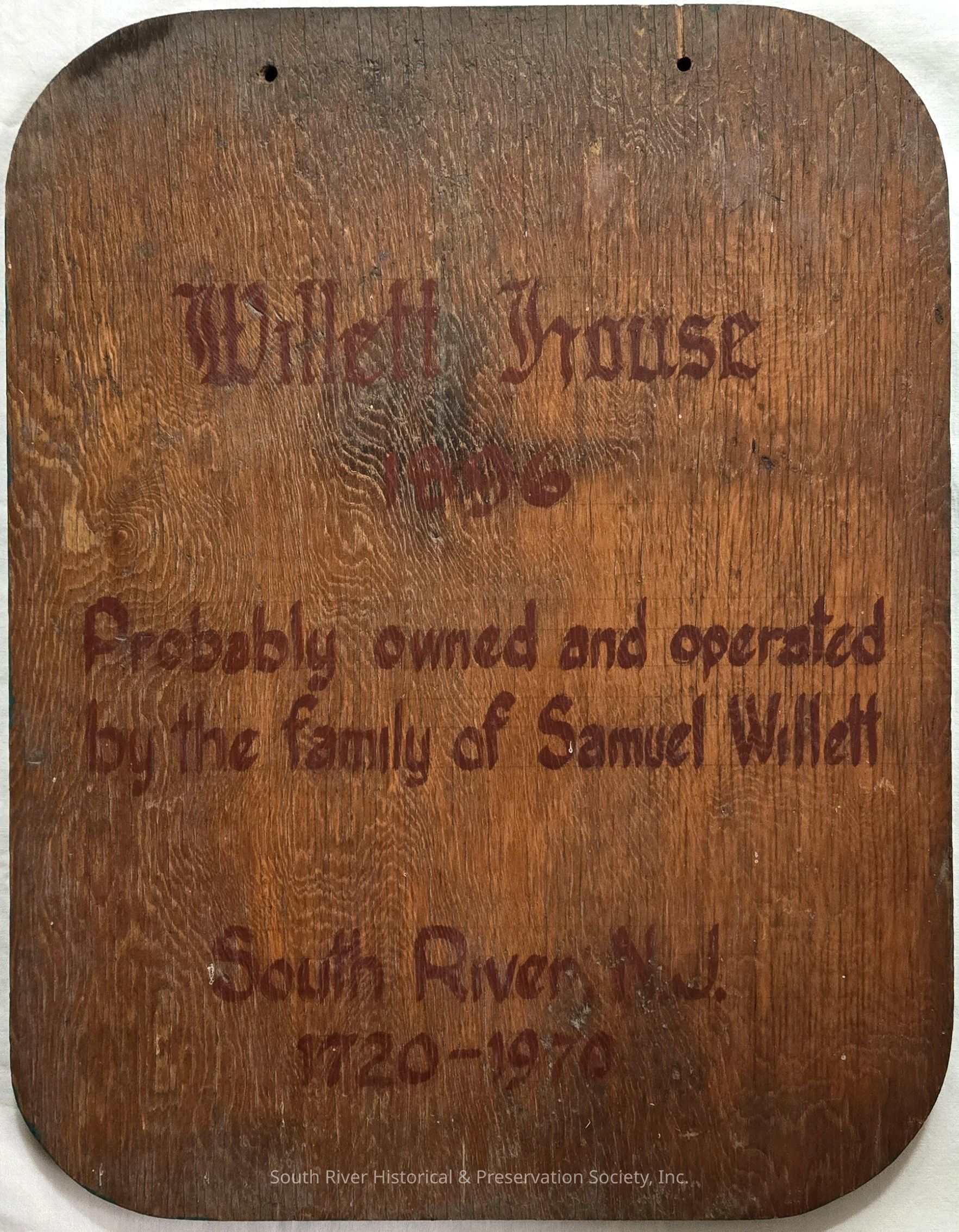 Wooden sign used to mark the location of "Willett House, 1896, Probably owned and operated by the family of Samuel Willett." The legend at the bottom reads, "South River, NJ, 1720-1970" indicating that the sign was part of the celebration of South River's 250th anniversary.