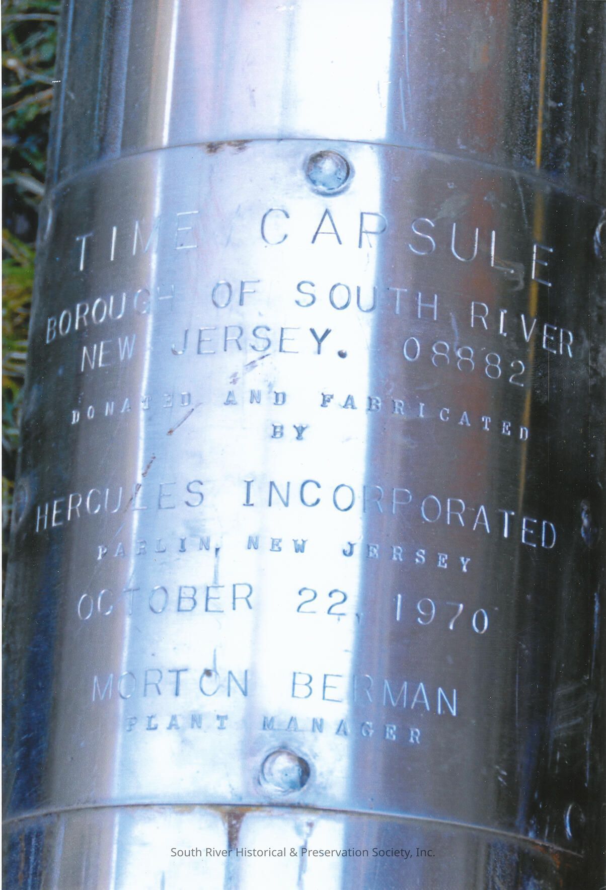 Photograph showing the engraving on the metal plate attached to the time capsule buried as part of the celebration of South River's 250th anniversary in 1970. Taken prior to the reburial of the capsule in front of the South River Museum in 2013. The plaque reads: