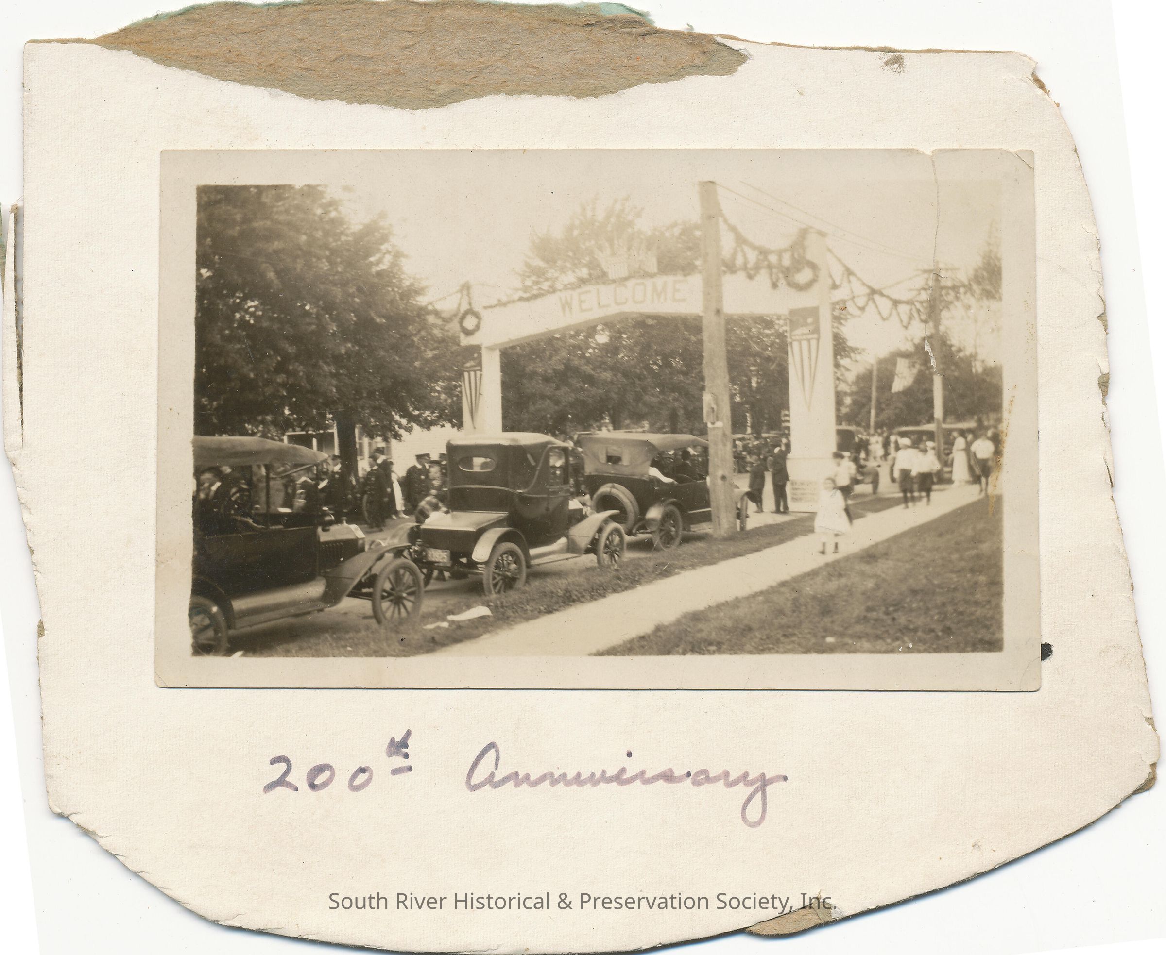 Photograph showing one of the Welcome arches erected during the South River's 200th Anniversary celebration in 1920. Two arches were planned, one at the corner of Main and Gordon Streets and the second at Jackson and Ferry Streets. Shown in the photo is an arch, likely the one at Main and Gordon Streets, with a row of automobiles parked at the side of the street. There are people walking on both sides of the street. Handwritten text on the cardboard reads: "200th Anniversary."