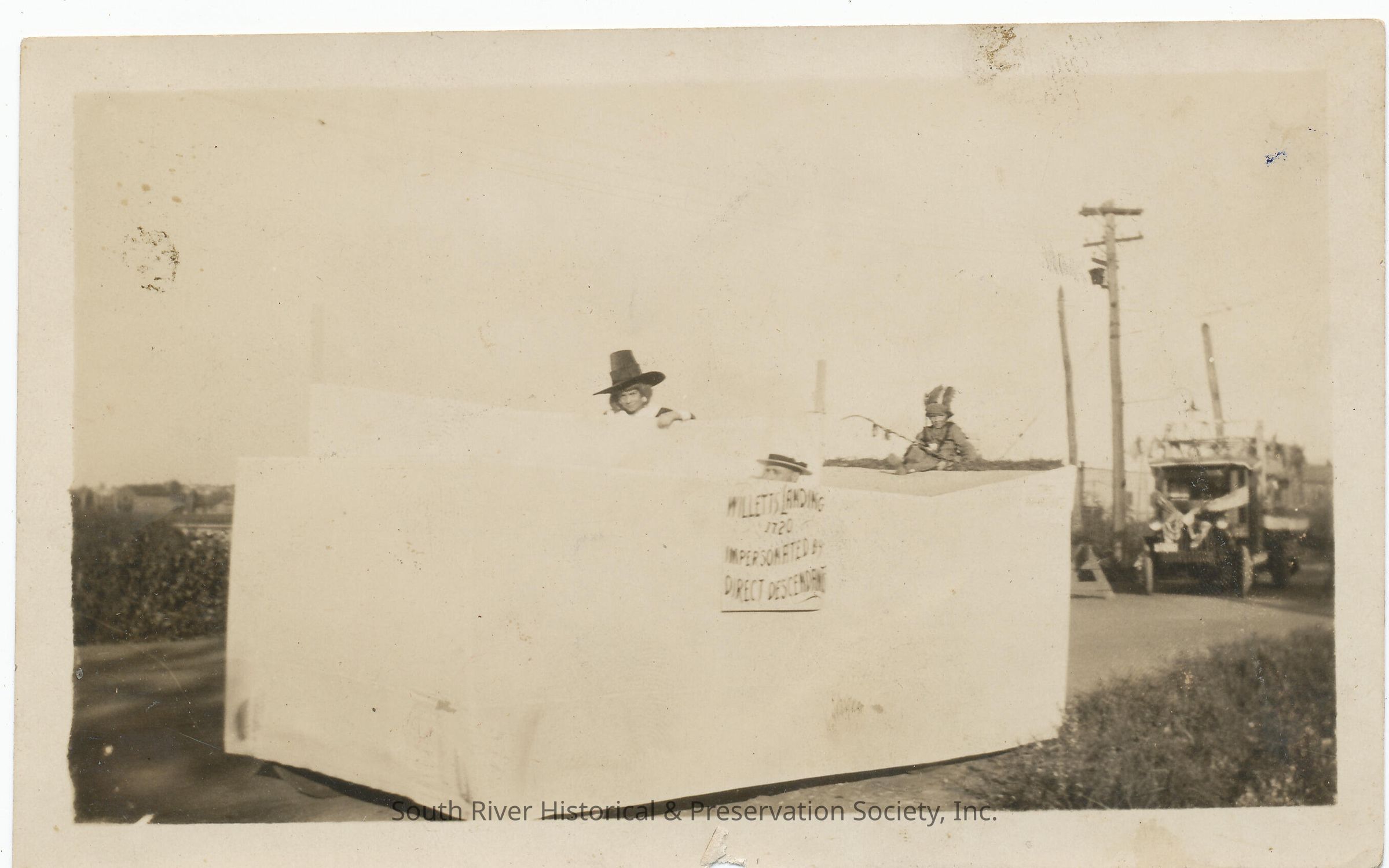 The float is described in a September 25, 1920 article in the Daily Home News. "The Landing of Samuel Willett, the founder of South River, in 1720, was cleverly impersonated by Masters Raymond Dudley Booraem and Warren Klauser Booraem sons of Mr. and Mrs. Raymond Booraem. The little ones are direct descendants. The impersonation was arranged on a float. One of the boys was seated in a large canoe and was looking longingly toward the most beautiful spot along the river which later was settled as Willetstown and now is the enterprising borough of South River which has been appropriately nicknamed "The Booming Borough." At the rear of the float lay an Indian, representing the inhabitants of this section when the Willetts first landed." It won first prize for the best float.