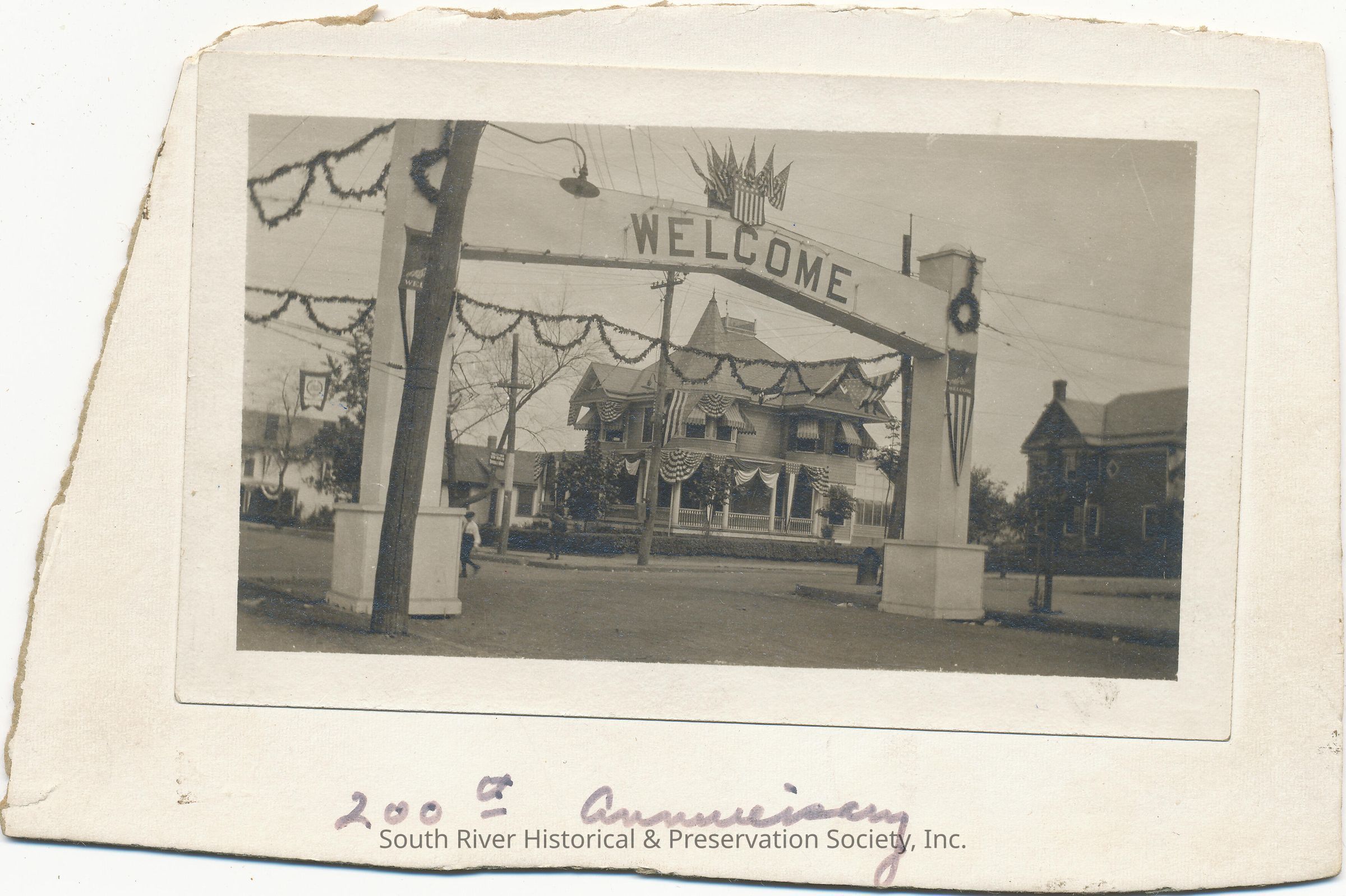 Photograph showing the Welcome arch for the 200th anniversary of South River. Framed within the arch is the decorated home of Asher W. Bissett located at the corner of Jackson Street and Whitehead Avenue. Handwritten text on the bottom edge of the cardboard reads: "200th Anniversary" in black ink.