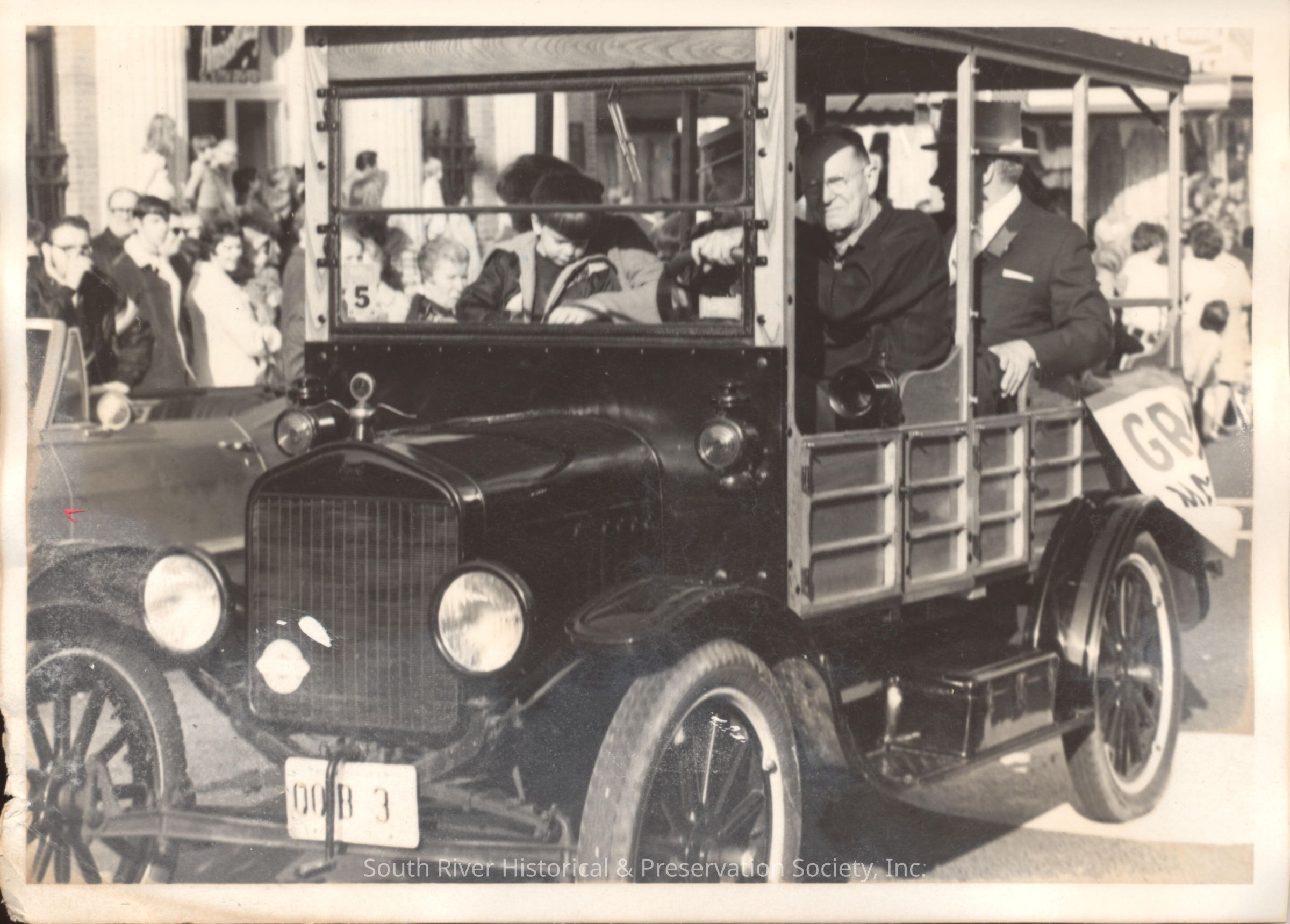 Photograph of an antique automobile hosting the grand marshals being driven in the parade held for the celebration of South River's 250th anniversary in 1970. The grand marshals were Walter Schack and Mary Serafin. The driver and other passengers in the vehicle are unidentified.